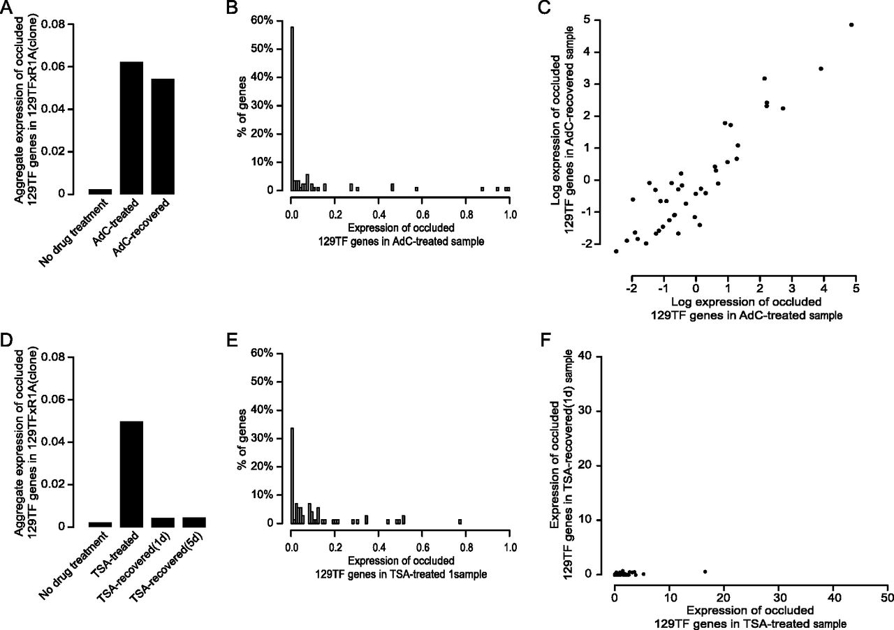 Permanent deocclusion of a subset of occluded genes in 129TF × R1A (clone1) by AdC but not TSA treatment. (A) AdC treatment caused a permanent increase in the expression of occluded 129TF genes in 129TF × R1A (clone1). Expression level is measured as the aggregate expression of occluded 129TF genes scaled to that of their R1A orthologs. (B) Histogram of occluded 129TF genes based on their expression levels in AdC-treated sample. Expression levels of individual 129TF genes are scaled to that of their R1A orthologs, and divided into 100 bins (expression levels >1 were combined into the last bin). Only genes for which the R1A copies are expressed at ≥2 TPG are considered. (C) Activation of occluded 129TF genes in 129TF × R1A (clone1) by AdC treatment is permanent. Expression levels of occluded 129TF genes in AdC-recovered sample are tightly correlated to that in AdC-treated sample, indicating that occluded 129TF genes activated by AdC treatment remained similarly active after seven days of recovery without the drug. Expression level is measured in TPG; logarithmic scales are used to allow better visualization of expression levels. (D) TSA treatment caused a transient increase in the expression of occluded 129TF genes in 129TF × R1A (clone1). Expression level is measured in the same way as in A. (E) Histogram of occluded 129TF genes based on their expression levels in TSA-treated sample. Expression level is measured in the same way as in B. (F) Activation of occluded 129TF genes in 129TF × R1A (clone1) by TSA treatment is transient. Activation of occluded 129TF genes in 129TF × R1A (clone1) by TSA treatment is reversed in TSA-recovered (1d) sample, indicating the highly transient nature of the activation. Expression level is measured in TPG.