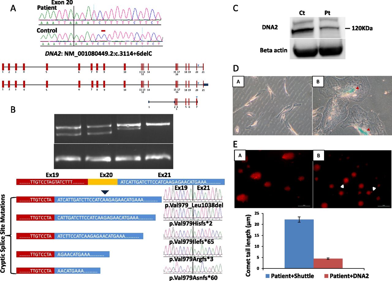 Identification of a novel DNA2 mutation that causes increased senescence and DNA damage in a family with Seckel syndrome. (A) Upper panel shows DNA sequence chromatogram with the novel 1-bp deletion variant identified in the two affected members of PD_F6, and a schematic of the three transcripts of DNA2 affected by the mutation. The site of mutation on the sequence chromatogram is denoted by a red bar, and blue triangles denote the position of the variant on the three DNA2 transcripts. (B) Upper panel shows the gel image of the RT-PCR that reveals the presence of an aberrant band in the two patients as well as the reduction of the normal band in Pt1 and Pt2 (23% and 53%, respectively). Note the absence of the aberrant band in the two controls. Lower panel shows a cartoon of DNA2 mRNA (only exons 19–21 are shown) and the result of cloning experiments on the RT-PCR product obtained from the patient RNA which revealed the presence of five aberrant transcripts, all sharing the same abnormal donor site, while each had a different acceptor site. (C) Immunoblotting using antibody against DNA2. The protein level of DNA2 from cells derived from index individual (Pt) were 50% reduced in comparison to the normal type control (Ct), respectively (the average of two independent experiments was 60%). (D) Images of beta-gal-stained control cells (A) and patient (B) showing the presence of blue staining and flattening of patient cells (red triangle). Please note that patient and control fibroblasts had a comparable number of passages (6–7). (E) Representative images and the quantification graph in the assessment of “comet tail” lengths from patient cells transfected with shuttle (A) and DNA2 (B). There was a significant reduction in the number of cells with comet tails as well as the size of comet tails (P = 4.4 × 10−6) obtained from the patient cells after exogenous expression of DNA2. Scale bar = 50 μm.
