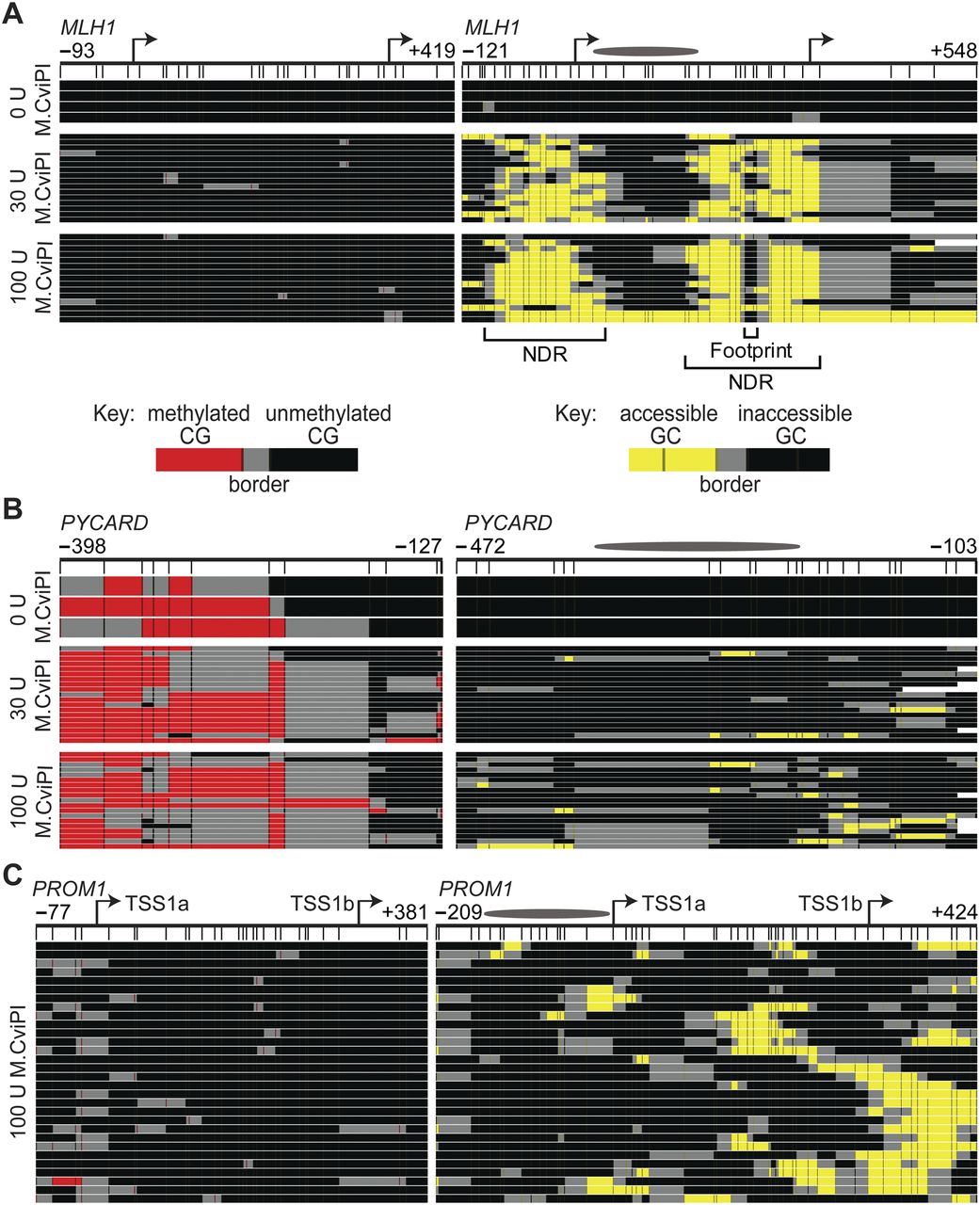 MAPit identifies expected epigenetic patterns and detects heterogeneous chromatin structures at specific loci. MAPit-BGS in NSC nuclei of the promoters of (A) MLH1 (expressed), (B) PYCARD (silenced), and (C) PROM1 (heterogeneously expressed) probed with the indicated units (U) of M.CviPI activity. A schematic of each promoter is indicated at the very top: bent arrows, TSSs; ellipses, length of a 147-bp nucleosome core particle; map coordinates relative to the first TSS are indicated for the most upstream and downstream CG (left) or GC (right) sites. Data were plotted with MethylMapper; each row of pixels represents one sequenced DNA strand or molecule, with the same top-to-bottom presentation order in each panel. Vertical hashes demarcate individual CG (left) or GC (right) sites (GCG excluded), and an additional site density plot is shown below each promoter schematic. The key for CG or GC methylation status is shown in A, bottom. Two or more consecutively methylated CG and GC sites are connected by red and yellow, respectively, whereas two or more consecutively unmethylated CG and GC sites are connected by black. Gray connects the borders between methylated and unmethylated sites. White at either end of a molecule indicates missing or unaligned sequence. Note a variably positioned NDR associated with the neural-specific TSS1b in the PROM1 promoter in C, whereas both TSSs at MLH1 in A colocalize with an NDR, the downstream from which is occupied by a DNA-binding factor(s) (labeled footprint).