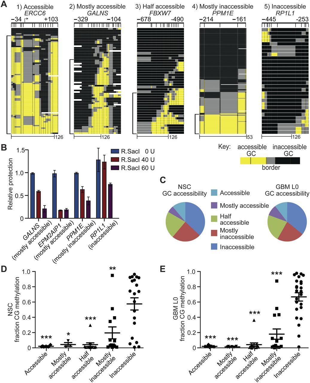 Chromatin accessibility in NSC and GBM L0 is heterogeneous and inversely associated with CG methylation. (A) Representative promoters exhibiting the five different GC accessibility patterns. Scale bars in base pairs included at bottom. Brackets at left of each image indicate accessible molecules. (B) Quantitative confirmation of different classes of chromatin accessibility identified by MAPit-patch obtained by measuring protection of SacI sites in the indicated promoters from 0, 40, or 60 units R.SacI activity. Each bar represents the mean protection for each promoter relative to 0-unit R.SacI ± 0.5 of the range (n = 2), normalized to a control locus lacking a SacI site. (C) Distribution of all analyzed promoters into the five accessibility classes for NSC (left) and GBM L0 (right). Dot plots for (D) NSC and (E) GBM L0 of CG methylation in each GC accessibility class. Mean fractions of CG methylation ± SEM are plotted. (*) P < 0.05; (**) P < 0.01; and (***) P < 0.001 relative to fraction CG methylation in inaccessible promoters for each sample.