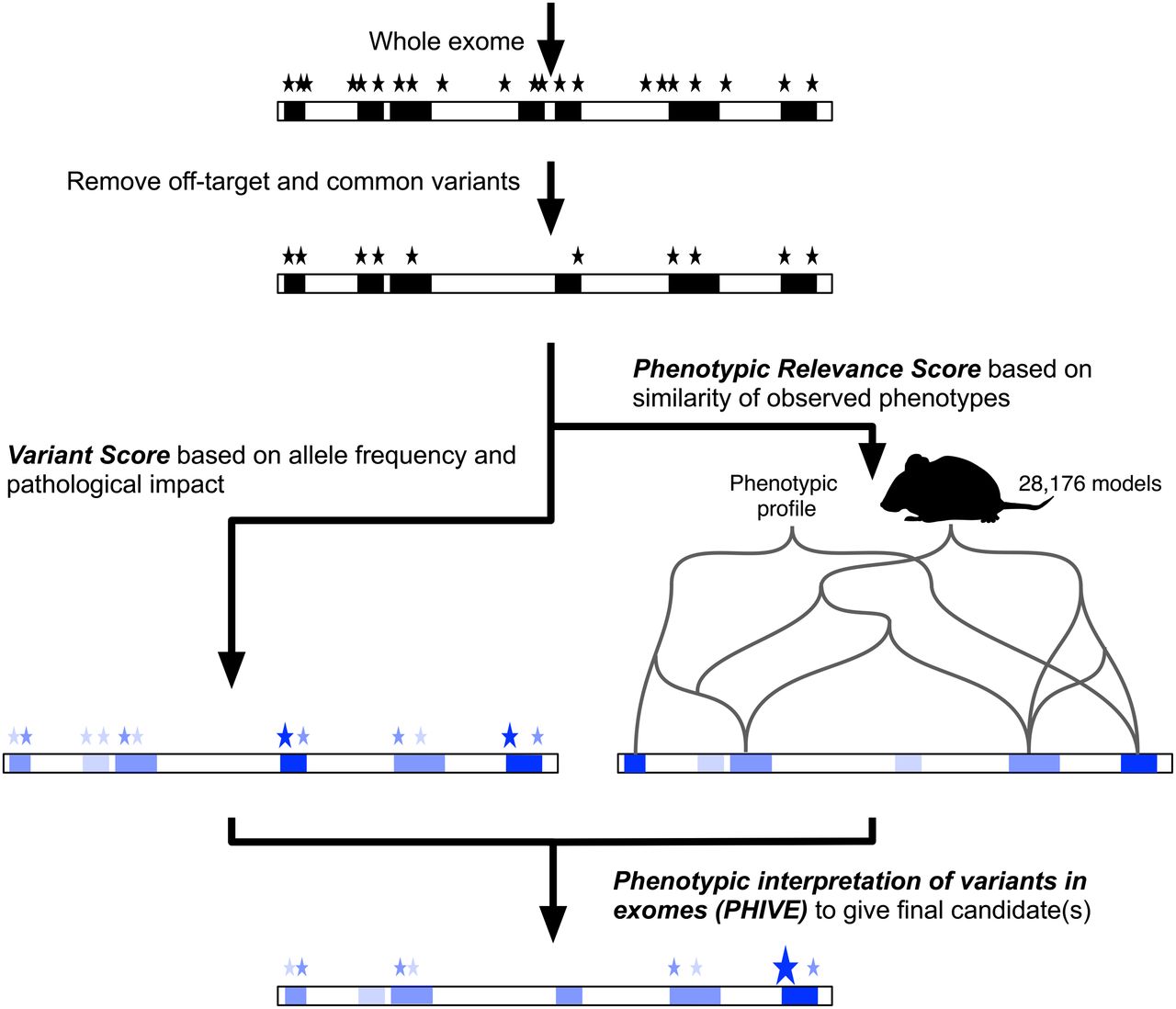 Exomiser filters a whole-exome data set by removing off-target, common, and synonymous variants from further consideration and evaluates the remaining variants based on the predicted pathogenicity and minor allele frequency (variant score). Optionally, an assumed mode of inheritance is used to further filter genes with variants present in a pattern compatible with the assumed mode of inheritance (e.g., homozygous or compound heterozygous for autosomal recessive). These genes are then assigned a phenotypic relevance score based on comparison with 28,176 mouse models with mutations in 9043 genes (7270 protein coding). The final ranking is calculated as the sum of the individual scores to yield the PHIVE score.