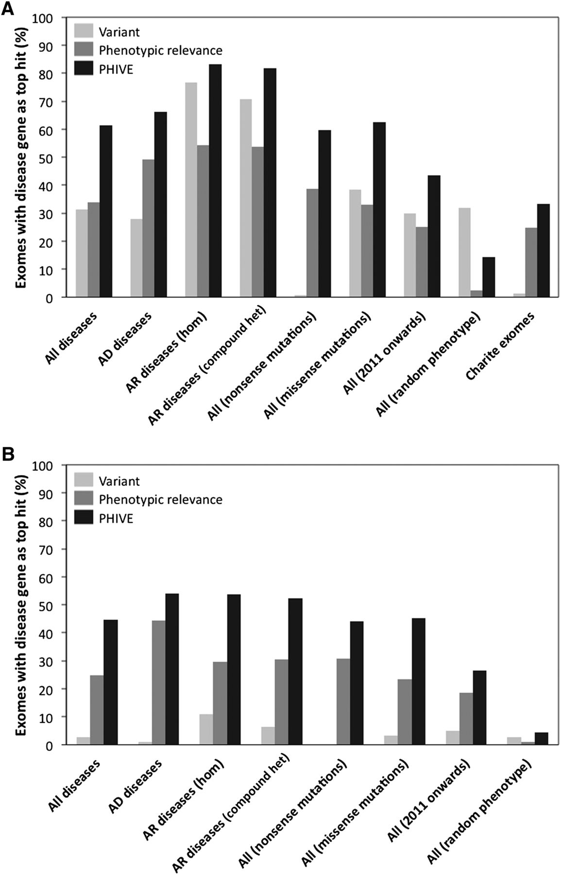 Comparison of different Exomiser filtering and prioritization strategies, including frequency data from either the ESP and the 1000 Genomes Project (A), or only ESP (B) to remove any potential bias due to the noncausative variants also coming from the 1000 Genomes Project. The first four groups of results show filtering of exomes (mean genes before filtering = 8388) by (1) removal of common, synonymous, and noncoding variants (mean genes after filtering = 400; 98.1% of disease variants retained) for All diseases, (2) further restriction to those compatible with Autosomal dominant (mean genes after filtering = 379; 98.5% of disease variants retained), or (3) Autosomal recessive inheritance by either homozygous or compound heterozygous mutation (mean genes after filtering = 37; 97.8% of disease variants retained). The performance for all diseases is also broken down into nonsense and missense mutations. In addition, we show the performance for all diseases in which the associated gene was discovered in 2011 or 2012 and the performance in which a random set of disease phenotype annotations were used rather than those of the disease being tested. Finally, the performance when adding known disease mutations to 144 exome samples from our own center rather than the 1000 Genomes Project exomes is shown. The bars show the percentage of times in which the true disease gene was assigned the top ranking match in 100,000 simulated WES data sets per analysis after prioritization based on the PHIVE score, variant score, and phenotypic relevance score.