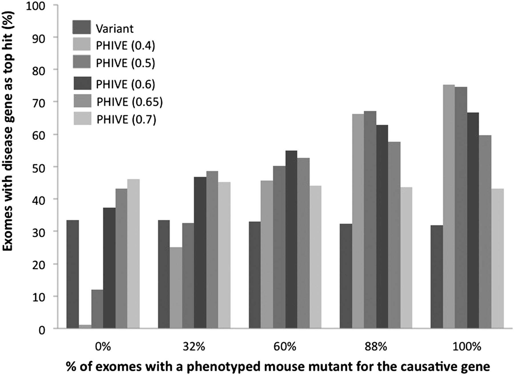 Comparison of different default phenotypic relevance scores for variants where no phenotyped mouse model exists for the gene containing the variant. The individual groups show the results after filtering to remove common, synonymous, and noncoding variants for exomes in which either 0, 32%, 60%, 88%, or 100% of the simulated exomes have a causative variant with mouse phenotype data for the orthologous gene. Thirty-two percent represents the current coverage of human protein-coding genes by phenotype data for the mouse ortholog. Eighty-eight percent represents the phenotypic coverage of disease-associated genes from the HGMD data set used throughout our studies. The bars show the percentage of times in which the true disease gene was assigned the top scoring match in 100,000 simulated WES data sets per analysis after prioritization based on either the variant score or PHIVE score using default phenotypic relevance scores of 0.4, 0.5, 0.6, 0.65, or 0.7.