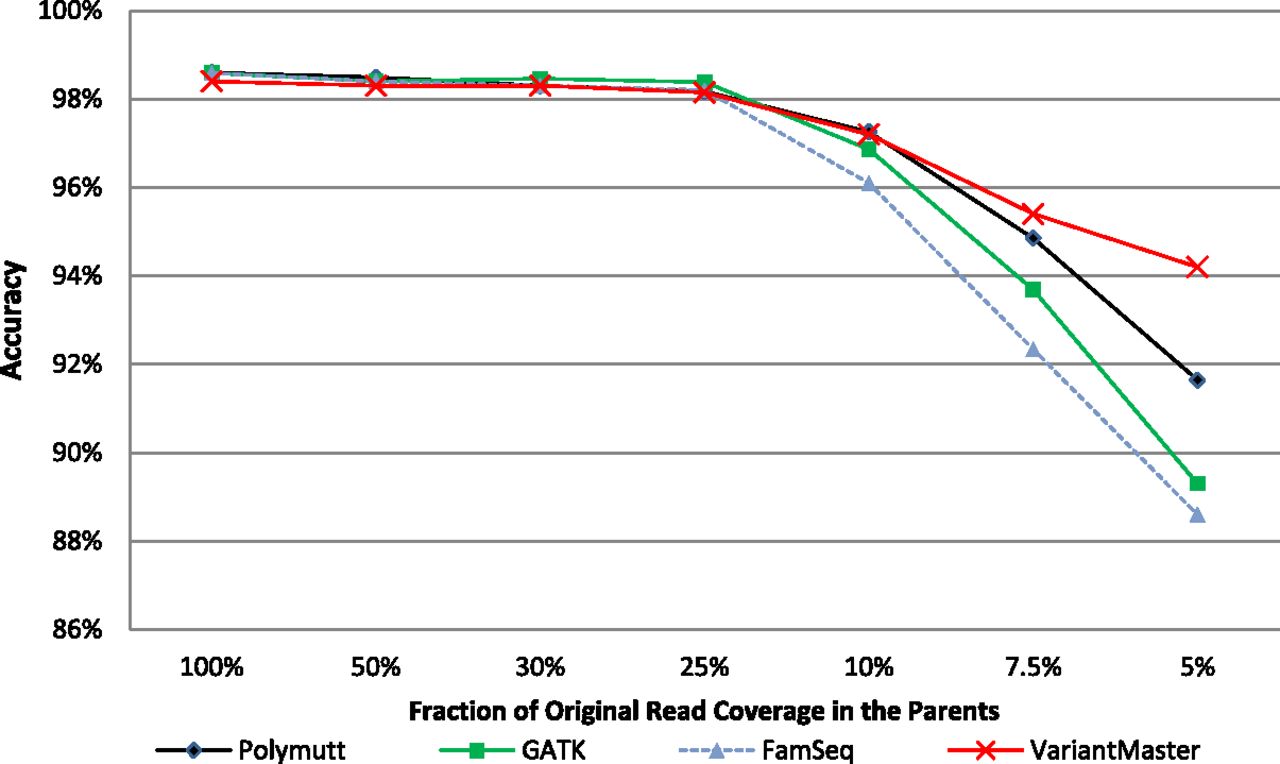 Conditional variant calling. VariantMaster, PolyMutt, and FamSeq correct variant calls (accuracy) of parents' WGS data—given the variants called by the GATK Unified Genotyper in the child—have been compared at decreasing read coverages in parents' data.