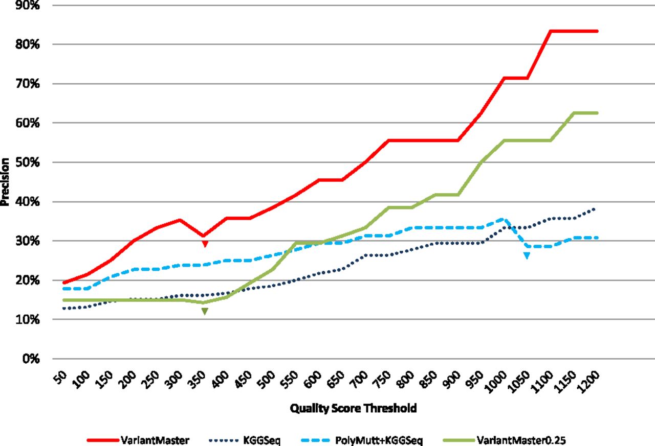 Extraction of de novo mutations from the CEU trio. Precisions obtained by VariantMaster, KGGSeq, and PolyMutt + KGGSeq, as functions of increasing quality score thresholds, have been plotted. Losses of true de novo variants have been emphasized with color-matching arrows. Precisions obtained by VariantMaster with a reduction to 25% coverage (∼10×) in the unaffected individuals are shown in green.