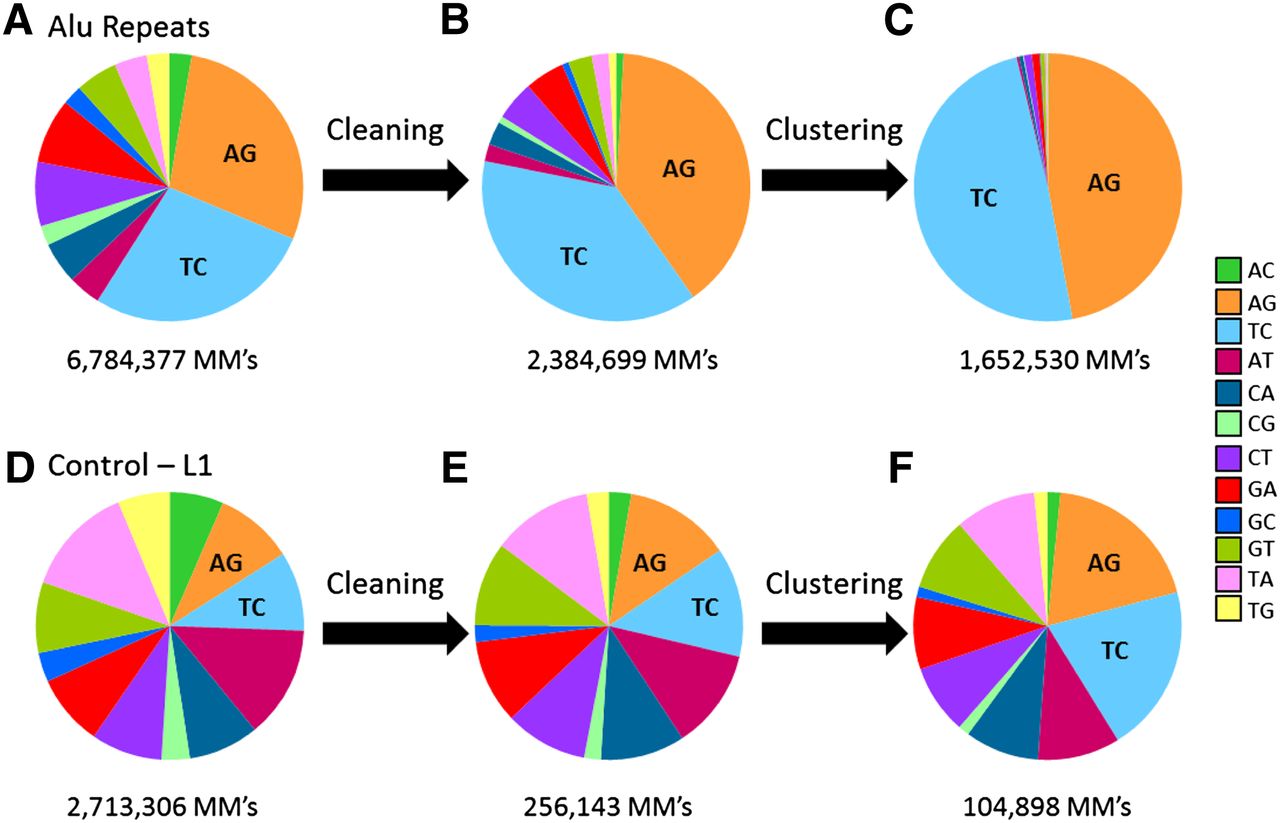 Mismatch distributions along the detection pipeline. (A) Even a simple count of all mismatches in high-quality base pairs of sequencing reads data of Alu repeats shows a significant enrichment of editing-derived mismatch types (AG and TC). (B) Applying a strict statistical model to filter out probable sequencing errors further increases the fraction of AG/TC mismatches, but results in the loss of most of the estimated true editing signal as well. (C) In this study, we focused on the full Alu repeats rather than single genomic sites. This improves the statistical power, with only a minor reduction in the signal. As a result, we found that virtually all Alu repeats are dominated by AG/TC mismatches. (D–F) The same pipeline applied to mismatches located in the common L1 retroelement. Clearly, the strong propensity for A-to-I RNA editing is unique to the Alu repeat. However, some enrichment of AG/TC mismatches is nevertheless observed, attesting to some editing activity in the L1 repeats.