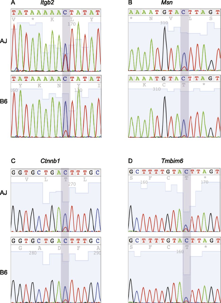 Validation of novel sites and the strain variability of C-to-T editing. Representative examples of Sanger sequencing chromatograms for editing of Itgb2, at chr10:77028356 (A); Msn, at chrX:93363499 (B); and Ctnnb1, at chr9:120869190 (C) in AJ and B6 macrophages. (D) Also shown is a previously confirmed edited site in Tmbim6 at chr15:99239051, which we used, together with the novel sites, to show the variability (chromatogram height for the nonreference base) of APOBEC1 editing activity in AJ and B6 macrophages.