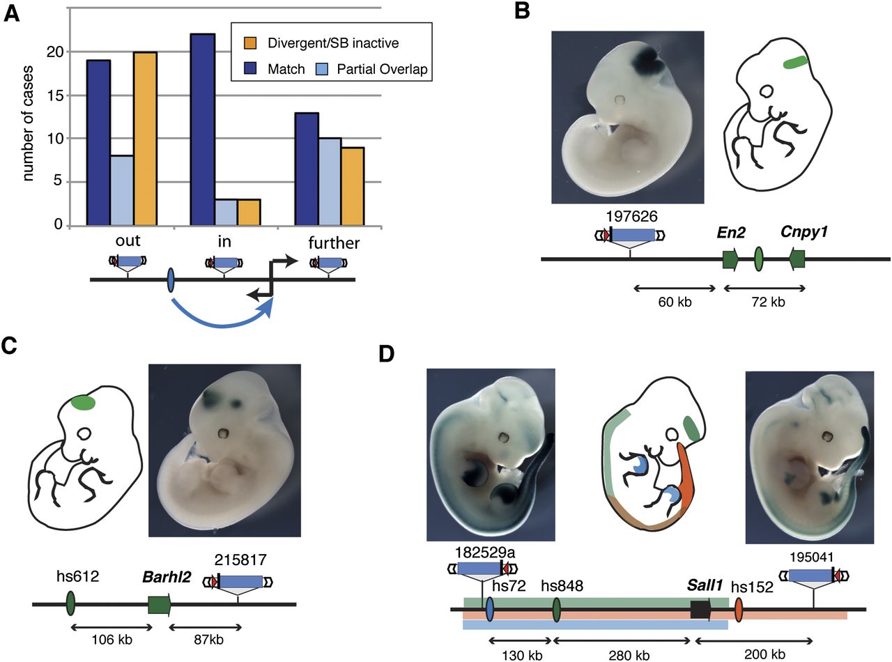 Non-gene-centric enhancer activities are detected across large distances. (A) The number of insertions that correctly (blue) or partially (light blue) reported the activity of a neighboring tissue-specific enhancer, or showed a different activity (orange). Insertions were grouped depending on their position relative to the enhancer/target gene, as shown below the chart. (B–D) Examples of expression detected with the regulatory sensor (photos) in non-gene-centered situations. Gene (arrows) and enhancer (ovals) activities are color-coded and shown on the embryo outline. (B) An insertion between the En2 and Cnpy1 genes matches their expression at the mid/hindbrain junction (Jukkola et al. 2006), as well as the activity of an enhancer on the far side of En2 (see also Supplemental Fig. 8) (C) Barhl2 expression in the midbrain and diencephalon requires remote enhancers (Saba et al. 2005), and a diencephalon enhancer (hs612) (Visel et al. 2007) is present upstream of this gene. Enhancer activity extends to a downstream insertion. (D) Sall1 gene expression is controlled by multiple enhancers spread in the two surrounding gene deserts, and insertions flanking the gene display overlapping expression patterns.