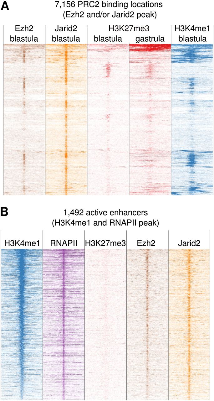 PRC2 is recruited to the majority of active developmental enhancers. (A) The majority of PRC2 binding sites do not gain H3K27me3. Heatmap of a hierarchical clustering of Ezh2, Jarid2, H3K27me3, and H3K4me1 enrichment around the summits of Ezh2 and Jarid2 peaks. Data are visualized in 100-bp bins in 10-kb regions. (B) PRC2 is recruited to active enhancers. Enrichment of H3K4me1, RNAPII, H3K27me3, Ezh2, and Jarid2 at active enhancers. Data are visualized in 100-bp bins in 10-kb regions and are sorted by H3K4me1. Enhancers are defined as RNAPII peaks in regions with H3K4me1 but not H3K4me3.