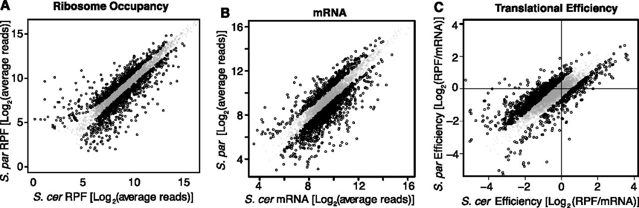 Comparing regulatory divergence of ribosome occupancy, mRNA abundance, and translation efficiency. (A–C) Scatter plots compare the normalized average number of sequence reads for S. cerevisiae (x-axis) and S. paradoxus (y-axis). Genes with statistically significant differences in read counts (FDR < 5%, minimum 1.5-fold difference) are plotted as open circles with black edges. Translation efficiency is defined here as the number of ribosome protected fragment reads (RPF) divided by the number of mRNA-seq reads covering an ORF.