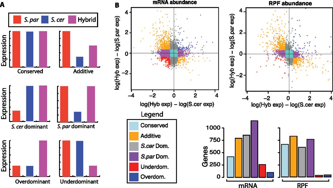 Inheritance of gene expression in F1 hybrids of S. cerevisiae and S. paradoxus. (A) Hypothetical patterns of gene expression in S. paradoxus (red), S. cerevisiae (blue), and F1 hybrid yeast (purple), depicting six modes of gene expression inheritance. (B) Scatterplots showing the difference between mRNA expression levels (left) in the F1 hybrid and S. cerevisiae (x-axis) and S. paradoxus (y-axis). The difference between ribosome occupancy levels (RPF) in the F1 hybrid and parental species is shown on the right. Bar plots show the number of genes in each inheritance category from ribosome occupancy data. Genes with overdominant (overexpressed) and underdominant (underexpressed) inheritance occur much less frequently when considering ribosome occupancy, as compared to misexpression in mRNA abundance.
