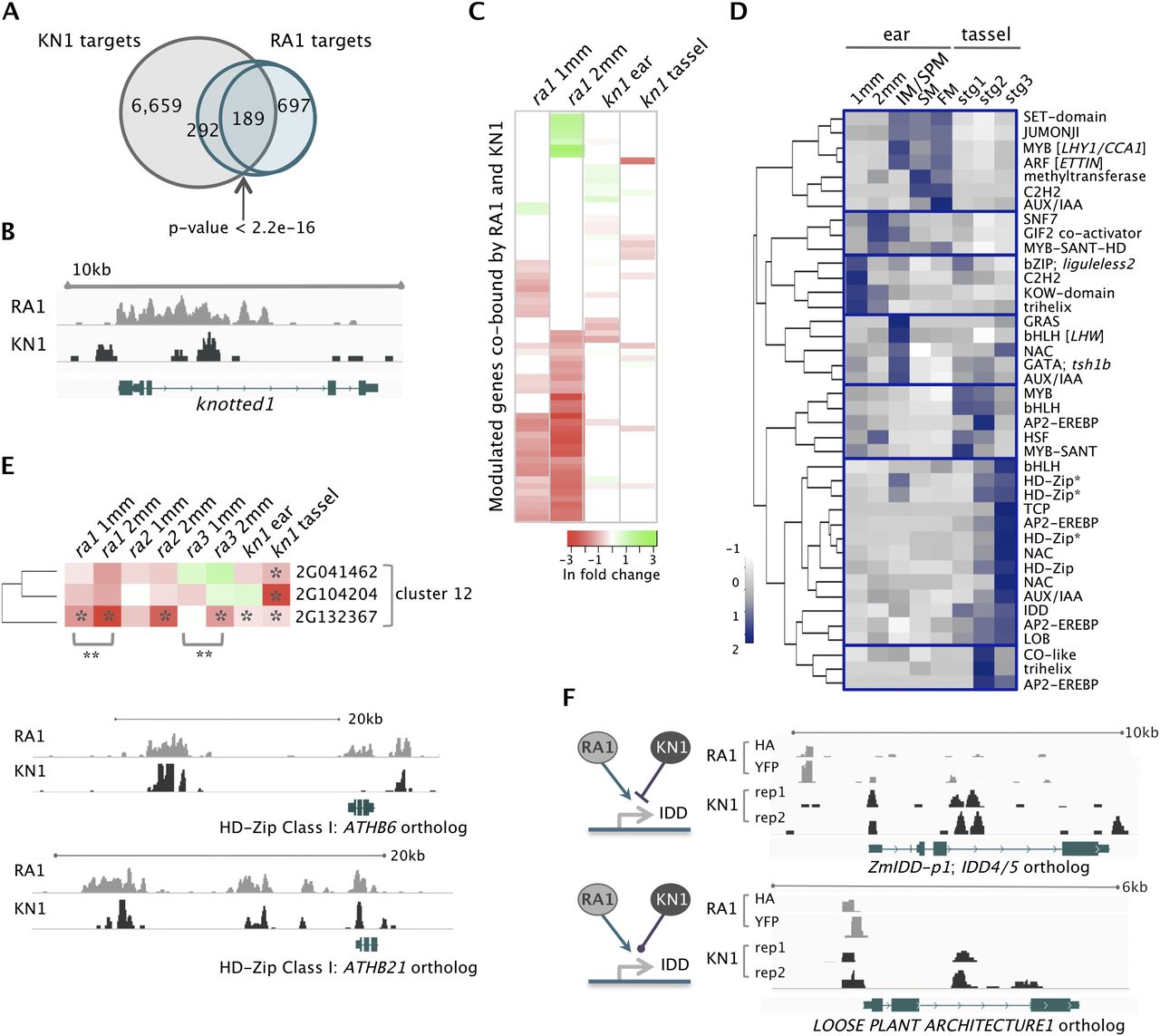 Integration of RA1- and KN1-dependent networks. (A) RA1 and KN1 bound 481 shared target genes (189 at the same genomic position), which was greater than expected by chance based on Fisher's test. (B) RA1 bound kn1 in its third regulatory intron. (C) Sixty-five targets were cobound by RA1 and KN1 at the same genomic position and differentially expressed in ra1 and/or kn1 loss-of-function mutants; these genes tended to have stronger dependence on RA1 than KN1 for their normal expression; (green to red) up- to down-regulation; (ln) natural log. (D) Expression profiles for 40 TFs cobound by RA1 and KN1 at overlapping genomic regions showed signatures of spatiotemporal regulation. TFs are listed by their family or protein domain name and, where provided, Arabidopsis ortholog name in brackets. (E) Three co-expressed HD-Zip Class I genes (indicated by an asterisk in D) were modulated targets of RA1 and/or KN1. All were significantly down-regulated ([*] P < 0.05) in kn1 tassels; GRMZM2G132367 was significantly down-regulated in ra1, ra2, and ra3 mutant ears by 2 mm and showed significant change ([**] P < 0.001) between 1 and 2 mm in ra1 and ra3, but its expression remained unchanged in wild-type ears from 1 to 2 mm. RA1 and KN1 also cobound putative intergenic regulatory regions ∼15 kb upstream of these HD-Zip genes. Shown are orthologs of ATHB6 (GRMZM2G132367) and ATHB21 (GRMZM2G104204). (F) IDD genes bound by both RA1 and KN1 were positively modulated by RA1. ZmIDD-p1 (GRMZM2G179677) was repressed by KN1 while expression of the LOOSE PLANT ARCHITECTURE 1 ortholog (GRMZM2G074032) was not significantly altered in kn1 mutants.