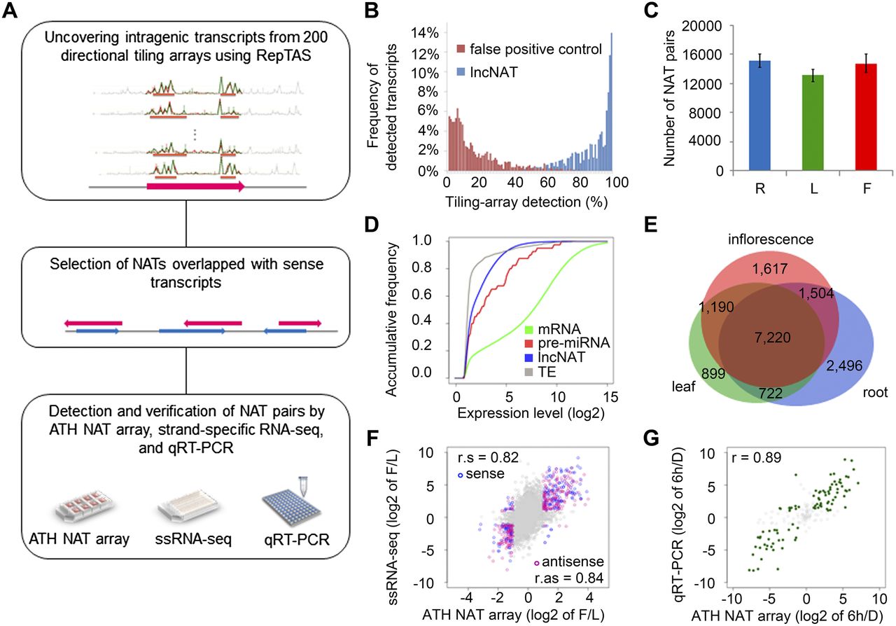 Identification and profiling of lncNATs in Arabidopsis. (A) Pipeline for the identification of lncNATs in Arabidopsis. NAT pairs were identified from mRNAs and RepTAS-uncovered novel intragenic transcripts. NAT pairs were verified by different platforms, including ATH NAT custom array, strand-specific RNA-seq (ssRNA-seq), and quantitative RT-PCR (qRT-PCR). (B) Detection of lncNATs in 200 tiling arrays. The x-axis represents the percentage of tiling arrays in which the transcripts could be detected, and the y-axis represents the percentage of detectable transcripts. Blue bars show lncNATs and red bars show false positives. (C) Reproducible detection of NAT pairs by ATH NAT custom array. The y-axis represents the number of detectable NAT pairs in all three biological replicates of each sample. (R) Roots; (L) leaves; (F) inflorescences. (D) Accumulative frequency of mRNA expression levels (green line), pre-miRNAs (red line), lncNATs (blue line), and transposable element transcripts (gray line) in roots. The x-axis represents the log2 value of normalized signal intensity and the y-axis represents accumulative frequency. (E) Venn diagram showing the number of organ-specific NAT pairs in roots (blue), leaves (green), and inflorescences (red). (F) Correlation between ATH NAT array and ssRNA-seq in the detection of organ-specific NAT pairs. The fold-change between leaves and inflorescences of sense transcript levels is represented by blue circles, and antisense transcript levels by pink circles. Gray circles are transcripts that do not show expression differences (less than twofold) between the two organs. (r.s) Correlation for sense transcripts; (r.as) correlation for antisense transcripts. (G) Correlation between ATH NAT array and qRT-PCR in the detection of light-responsive NATs. The x-axis gives the log2 value of fold change detected by ATH NAT array and the y-axis gives the value detected by qRT-PCR. Gray circles represent NATs that do not change more than twofold in expression after light treatment. (6h) Samples treated with 6 h of continuous white light; (D) etiolated seedlings.