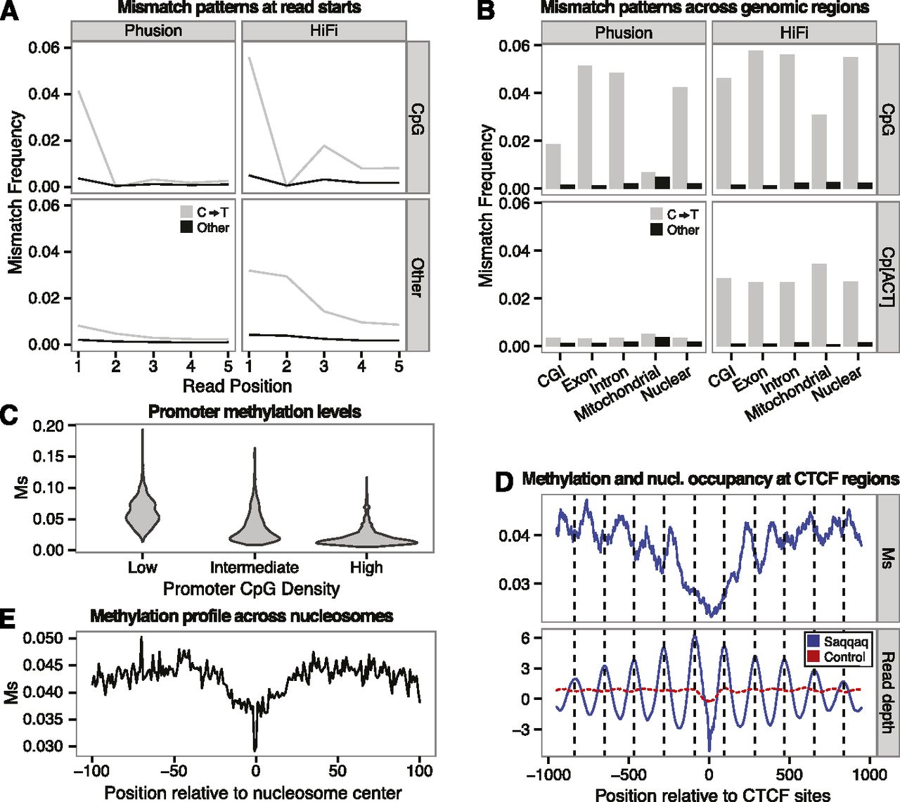 Substitution rates at CpG reveal methylation of DNA. (A) C→T mismatch rates (gray) versus rate of other mismatches (black) between a random subset of 1,000,000 Phusion (left) or HiFi (right) reads mapping uniquely. Reads are split by those starting with CpG (top; 26,864 Phusion and 25,568 HiFi reads) and other dinucleotides (bottom). (B) Mismatch frequencies for Phusion (left) and HiFi (right) for reads aligned to various genomic locations starting with the dinucleotides: CpG (top) and Cp[ACT] (bottom). (C) Distribution of Ms values for three classes of promoters with low, medium, and high CpG densities (Supplemental Material SI3.2). (D) Methylation profile (Ms, top) and read depth variation (bottom) at CTCF regions. Read depth provides a proxy for nucleosome occupancy. (E) Distribution of Ms values across nucleotide positions covered with nucleosomes, showing a depletion in methylation levels within a core region (20 nt before and after the nucleosome center) that is particularly marked at the nucleosome center.