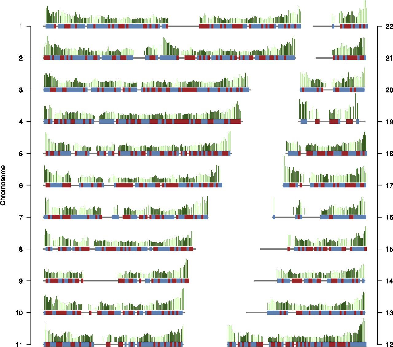 Recombination map for the human–chimpanzee ancestor. The inferred recombination map normalized to a global mean of one. Each gray line represents a chromosome, and the impulses over each line represent the recombination rates for nonoverlapping 1-Mb bins. The vertical distance between chromosomes represents 5 cM/Mb. Red (blue) blocks painted on each chromosome correspond to 2-Mb regions where mean recombination rate in the human (chimpanzee) map is most similar to the ancestral map.