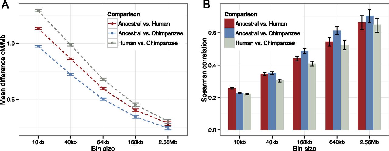The human–chimpanzee ancestor map compared with the human and chimpanzee maps. (A) Mean absolute difference in recombination rate between the noninverted part of the ancestral, human, and chimpanzee maps (excl. chromosome 2) for nonoverlapping bins quadrupling from 10 kb to 2.56 Mb. Error bars indicate standard error of mean obtained by bootstrapping. (B) Spearman correlation between the noninverted part of the ancestral, human, and chimpanzee maps (excl. chromosome 2) for bins as in A. Confidence intervals for individual correlations and significance of difference between correlations were obtained by bootstrapping. The only comparisons not significant (P-values > 0.05) are ancestral–chimpanzee vs. ancestral–human for 40 kb and 2.56 Mb, and ancestral–human vs. human–chimpanzee for 640 kb and 2.56 Mb.