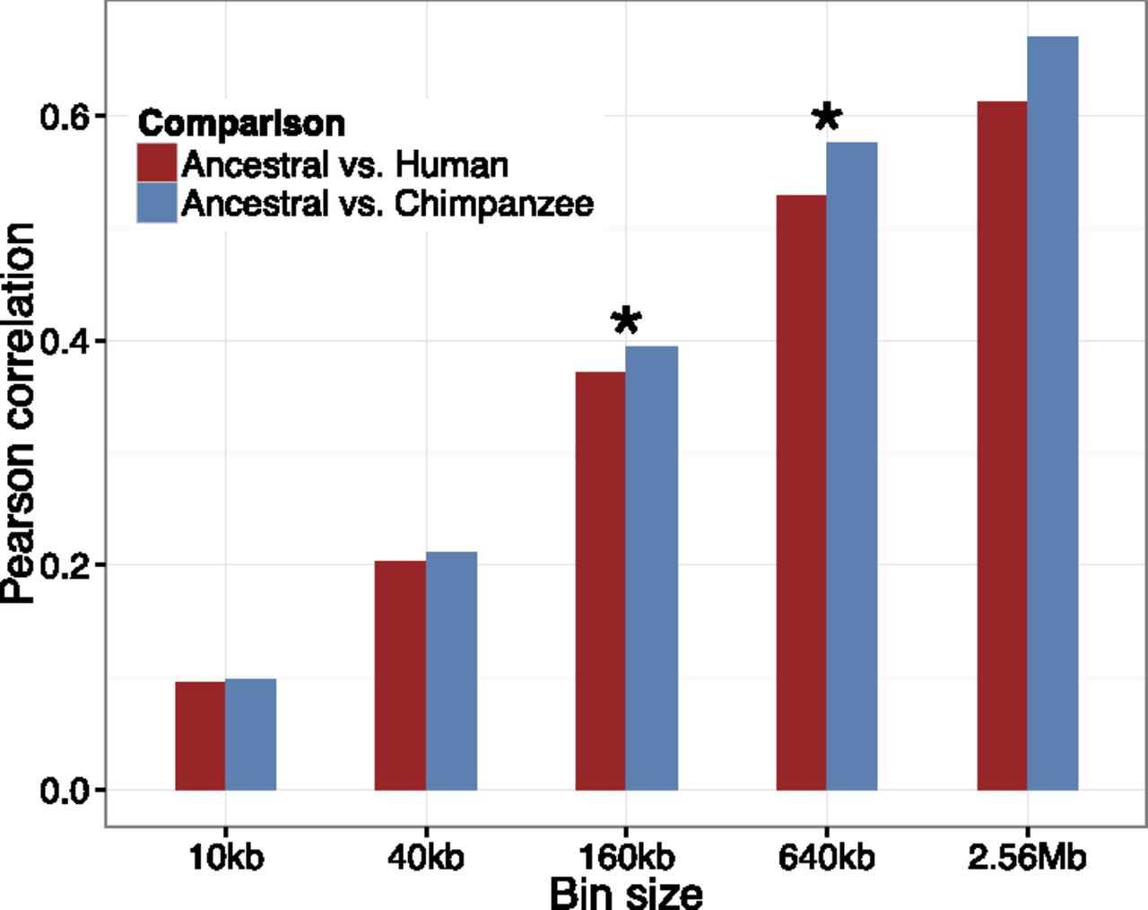 Correlation between GC* in noninverted regions (excl. chromosome 2) for the three species using the same bins as in Figure 4. The ancestral–chimpanzee correlations are significantly larger than the ancestral–human correlations for the 160-kb and 640-kb bins (evaluated using bootstrapping).