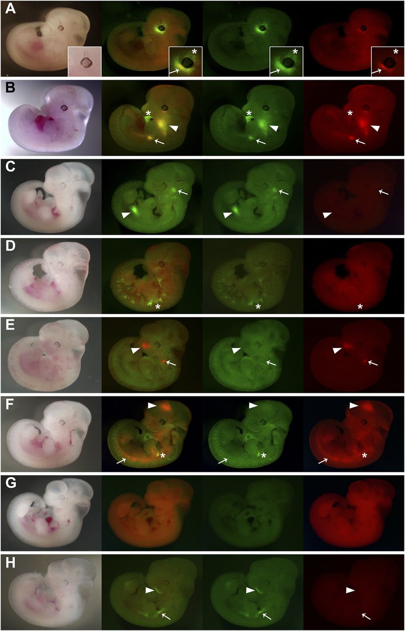 Mouse transgenic ED lines. Eight mouse transgenic embryos were generated using the ED system. (A) In this example, GFP expression is detected in the dorsal periocular mesenchyme (asterisk; inset), and coexpression of GFP and RFP is observed in the ventral periocular mesenchyme (arrow; inset). (B) Strong GFP expression is detected in the heart (asterisk), while GFP and RFP coexpression is detected at the base of the forelimb (arrow), the branchial arches (arrowhead), and at low levels in the somites. (C) GFP expression is detected in the trigeminal ganglion (arrow) and the midgut (arrowhead), while RFP expression is not detected. (D) This embryo expresses GFP throughout the embryo in migratory cells that probably correspond to dermis (asterisk), while RFP is found ubiquitously at low levels. (E) RFP expression is detected in the olfactory pits (arrowhead) and the second branchial arch (arrow), possibly in the mesodermal core, while GFP is detected at low levels ubiquitously. (F) RFP expression alone is detected in the forebrain (arrowhead), somites (arrow), and cells migrating into the limb buds; RFP and GFP coexpression is strongly detected in the proximal region of the forelimb (asterisk), while unique GFP expression is detected at low levels ubiquitously. (G) GFP and RFP are coexpressed ubiquitously at low levels. (H) Expression of GFP alone is observed superficially in the mandibular component of the first branchial arch (arrowhead), in tissues surrounding the fore and hindlimbs (arrow), and RFP expression is not detected. The stages of the embryos shown are 11.5 d post-coitum (dpc; A,B) and 10.5 dpc (C–H). The first column presents transmitted light images, the second an overlay of GFP and RFP channels, the third the GFP channel alone (green), and the fourth the RFP channel alone (red).