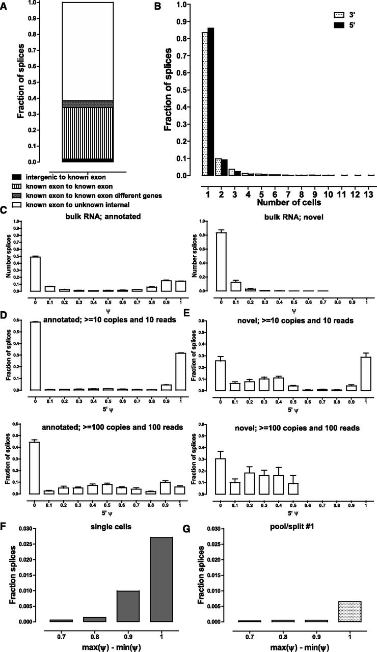 Alternative splicing at the single-cell level. (A) Classification of new junctions connecting known splice sites. (B) Frequency of detection of novel splice junctions. Novel junctions for which neither the donor nor acceptor site has been annotated were excluded for reasons described in the main text in both A and B. A threshold of 10 estimated copies and a coverage of 10 reads was applied, but results are essentially the same, independent of the thresholds used (Supplemental Fig. 40A). (C) Distribution of ψ scores in bulk RNA samples for annotated and novel splice junctions. A threshold of 15 reads combined for all splice junctions in which a donor or acceptor site participates was applied. Note that for each ψ1 score there is at least one matching ψ2 ≤ 1 − ψ1 score corresponding to the other alternative junction; in some cases, more than two alternative donor or acceptor sites exist; thus the relative height of the 0 ≤ ψ ≤ 0.1 bar. (D, upper and lower). Distribution of 5′ ψ scores for annotated splice junctions at two different detection thresholds in single-cell libraries (see Supplemental Fig. 41 for more detail). (E, upper and lower) Distribution of 5′ ψ scores for novel splice junctions at two different detection thresholds in single-cell libraries (see Supplemental Fig. 42 for more detail). (F,G) Frequency of major splice site usage switches between individual cells (F) and individual libraries in a pool/split experiment (G). Note the strong support for major splice site use switching across the collection of single cells.