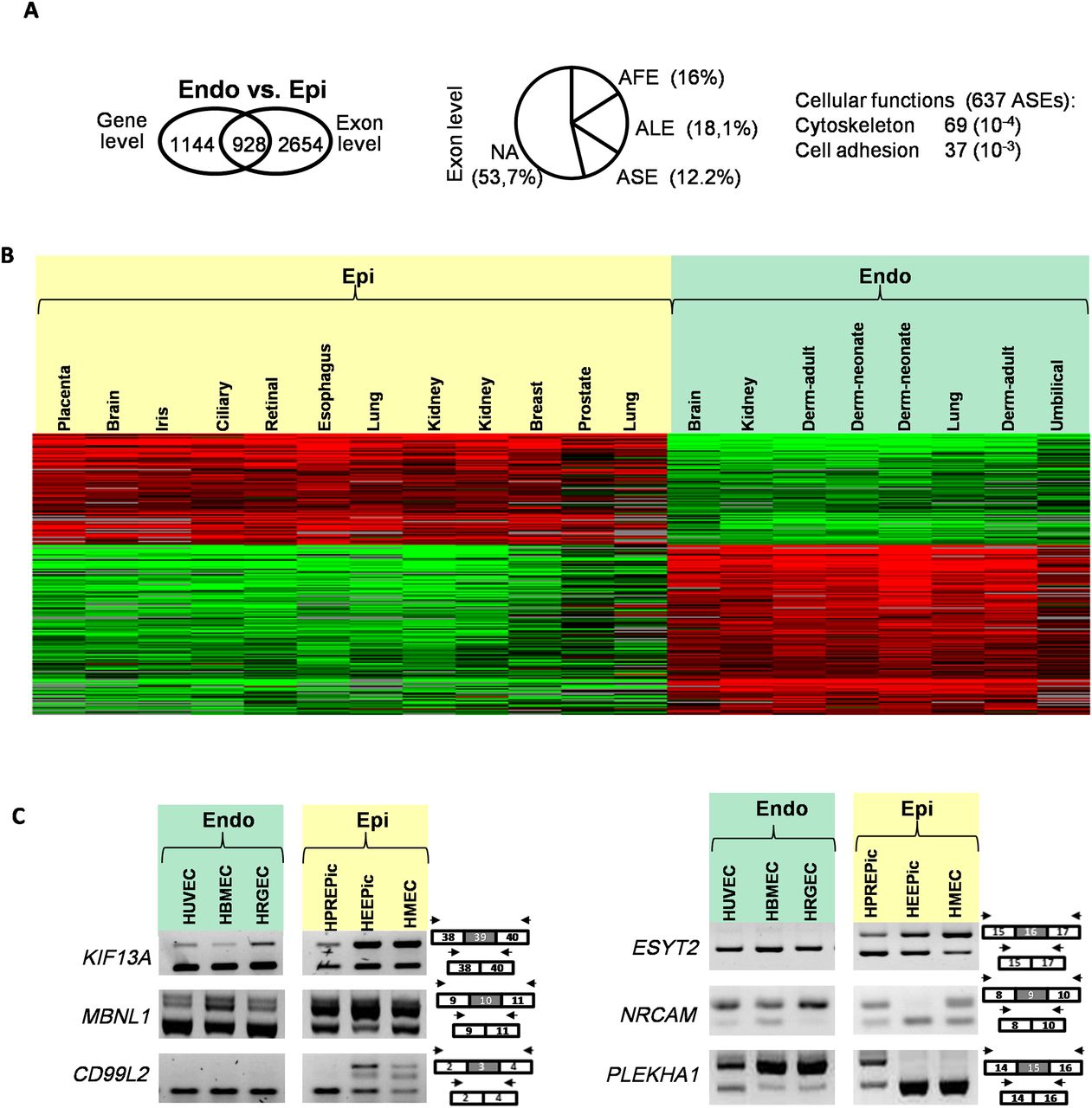 Epithelial- and endothelial-specific splicing variants. (A) Same as in Figure 1A but comparing endothelial (Endo) to epithelial (Epi) cells. (B) Same as in Figure 1B but comparing endothelial (Endo) to epithelial (Epi) cells. (C) RT-PCR validations using RNAs from endothelial and epithelial cells, as indicated.