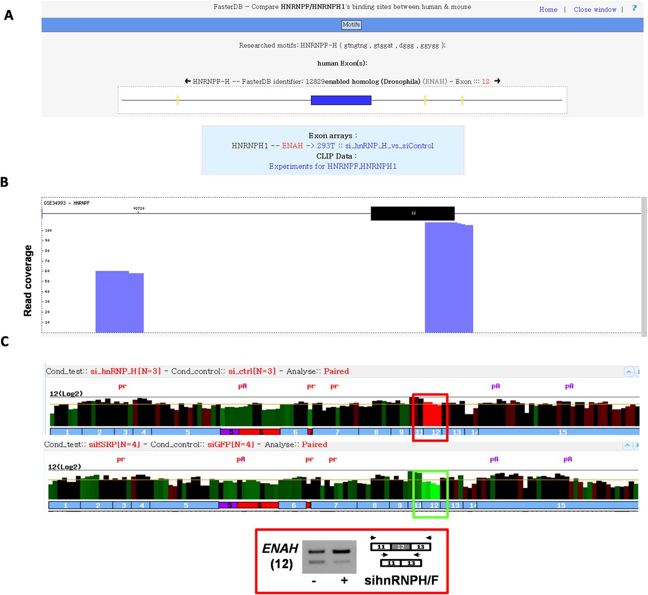 Dedicated CLIP-seq data visualization web interface. (A) Localization of predicted hnRNPH/F binding motifs in the vicinity of the ENAH exon 12 and their link to splicing factor data sets. (B) Reads from a CLIP-seq experiment corresponding to hnRNPF binding sites in the vicinity of the ENAH exon 12. (C) Visualization of exon array probe intensities in hnRNPH/F- or ESRP1-depleted cells as compared to control cells. RT-PCR analysis of the ENAH exon 12 inclusion rate in hnRNPH/F-depleted or control cells.