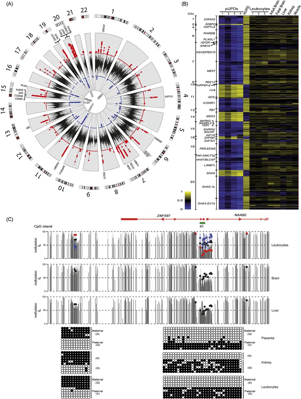 Identification of known imprinted DMRs on the Infinium array platform. (A) Circular karyotype showing the difference of methylation for three consecutive probes for reciprocal UPD leukocyte samples. Red dots indicate a minimal difference of 0.3 in Infinium probe β-values (>30% absolute methylation value) for regions with maternal methylation, and blue dots indicate the same for paternal methylation. Known DMRs are indicated. (B) Heat map of the Infinium probes located within known imprinted DMRs in reciprocal genome-wide UPD samples and various somatic tissues. (C) WGBS and Infinium array methylation profiles of the ZNF597 locus with bisulfite PCR confirmation of the novel maternally methylated DMR and its position in relation to the somatic paternally methylated promoter region. Vertical gray lines in the WGBS tracks represent the mean methylation value for individual CpG dinucleotides calculated from multiple data sets, with the light gray lines representing the mean + standard deviation. Infinium methylation values for normal tissues are represented by black dots, with values for the genome-wide UPDs (average pUPD in blue and mUPD in red) superimposed on the leukocyte methylation track. The error bars associated with the Infinium array probes represent the standard deviation of multiple biological samples. The PCR confirmation in placenta, kidney, and leukocyte-derived DNA was performed on heterozygous samples. Each circle represents a single CpG dinucleotide on a DNA strand. (●) Methylated cytosine, (○) unmethylated cytosine. Each row corresponds to an individual cloned sequence.