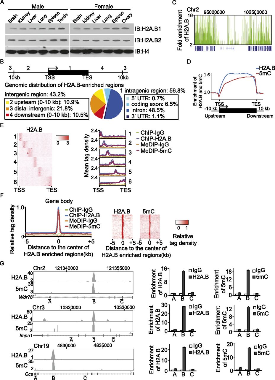 H2A.B is associated with 5mC in the gene body. (A) H2A.B is ubiquitously expressed in major organs. Chromatin fractions from different mouse tissues are subjected to Western blotting with anti-H2A.B1 and H2A.B2 antibodies. Anti-histone H4 is used as a protein loading control. (B) Genomic distribution of H2A.B in different regions is summarized in a pie chart. (TSS) transcription start site, (TES) transcription end site. (C) A snapshot of the distribution of H2A.B (green) in the region of chr2: 90,353,915–106,163,465 in mouse ES cells. Gene structure is indicated in blue at the bottom of the plot. (X-axis) The indicated genomic region; (y-axis) the fold enrichment of H2A.B compared to the irrelevant IgG control. (D) Relative enrichment of H2A.B and 5mC within 10 kb upstream of and downstream from the gene body in mouse ES cells. (X-axis) Relative gene position; (y-axis) relative fold enrichment. (E) Heat map represents the clusters of H2A.B enrichment in gene bodies in mouse ES cells. The tag density of H2A.B is calculated and subjected to k-means clustering. Six major clusters were indicated (left panel). Mean tag density of H2A.B and 5mC are plotted in each cluster (right panel). (Y-axes) Mean tag density. Irrelevant IgG was used as the control in ChIP-seq and MeDIP-seq. (F) Normalized tag density of 5mC in H2A.B-enriched gene body region. The detailed analyses are included in the Methods section. (G) Representative regions show the overlap between H2A.B and 5mC. In the left panels, the x-axes indicate the genomic regions. The y-axes represent the fold enrichment of H2A.B and 5mC. Three different regions in each gene are examined by ChIP-qPCR and MeDIP-qPCR to confirm the ChIP-seq and MeDIP-seq analyses. Data are presented as mean ± SEM (n = 3).