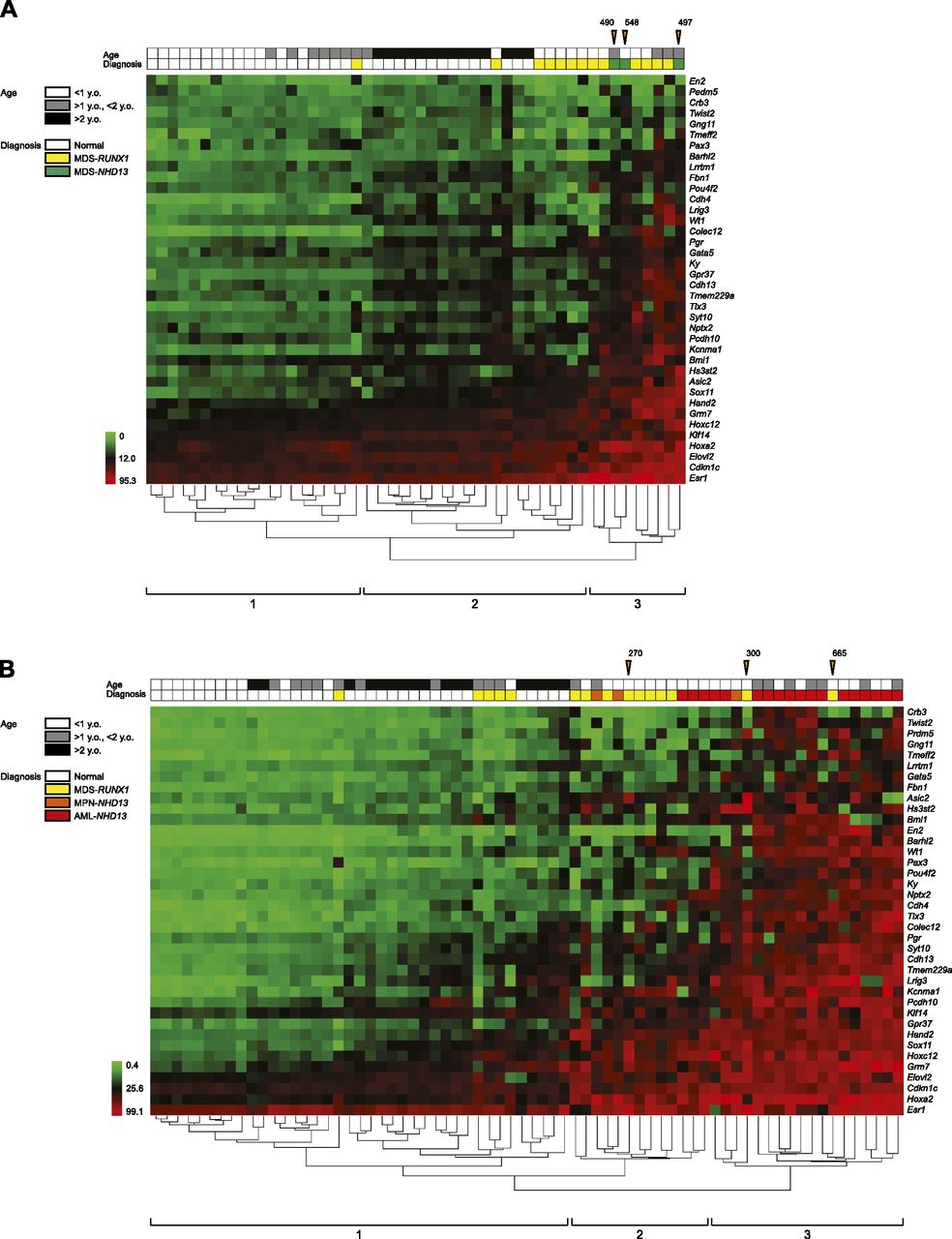 Hierarchical clustering analysis of methylation markers in mouse. (A) Hierarchical clustering analysis in bone marrow. Green to red cells indicate the range of methylation percentage from 0 to 95.3. The color codes for mouse strain, tissues, age, and diagnosis are listed on the left side. Orange arrowheads indicate samples for MCAM with number of methylated genes by MCAM. (B) Hierarchical clustering analysis in spleen.