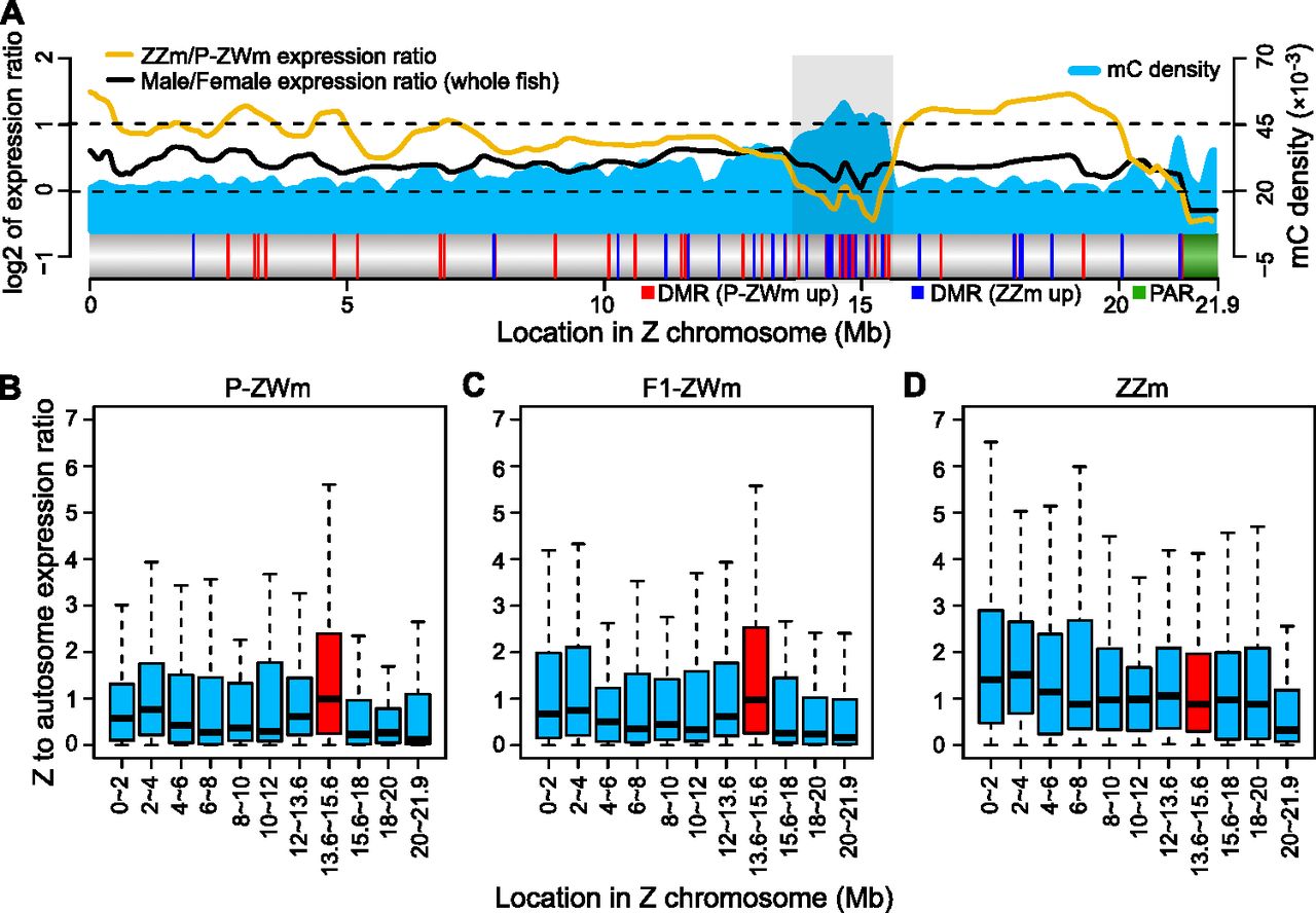 Dosage compensation of the Z chromosome in pseudomale testes. (A) Methylated cytosine (mC) density (5-kb window), log2-transformed expression ratios (running averages of 20 genes), and DMR profiles of the Z chromosome. The light gray box indicates the outstanding dosage-compensated region where DMRs were concentrated ([red vertical lines] DMRs that were up-methylated in P-ZWm, [blue vertical lines] DMRs that were up-methylated in ZZm), and the green block indicates the pseudoautosomal region (PAR) where Z and W chromosomes still pair in meiosis. Only 22 genes were annotated in PAR. Z-chromosomal to autosomal gene expression ratios (Z:A) in P-ZWm (B), F1-ZWm (C), and ZZm (D). The dosage compensation region (light gray box in A) is plotted in red. For each Z interval, the expression level of each Z-gene was first divided by the median expression level of all autosomal genes, then the Z:A ratios in each interval were plotted.