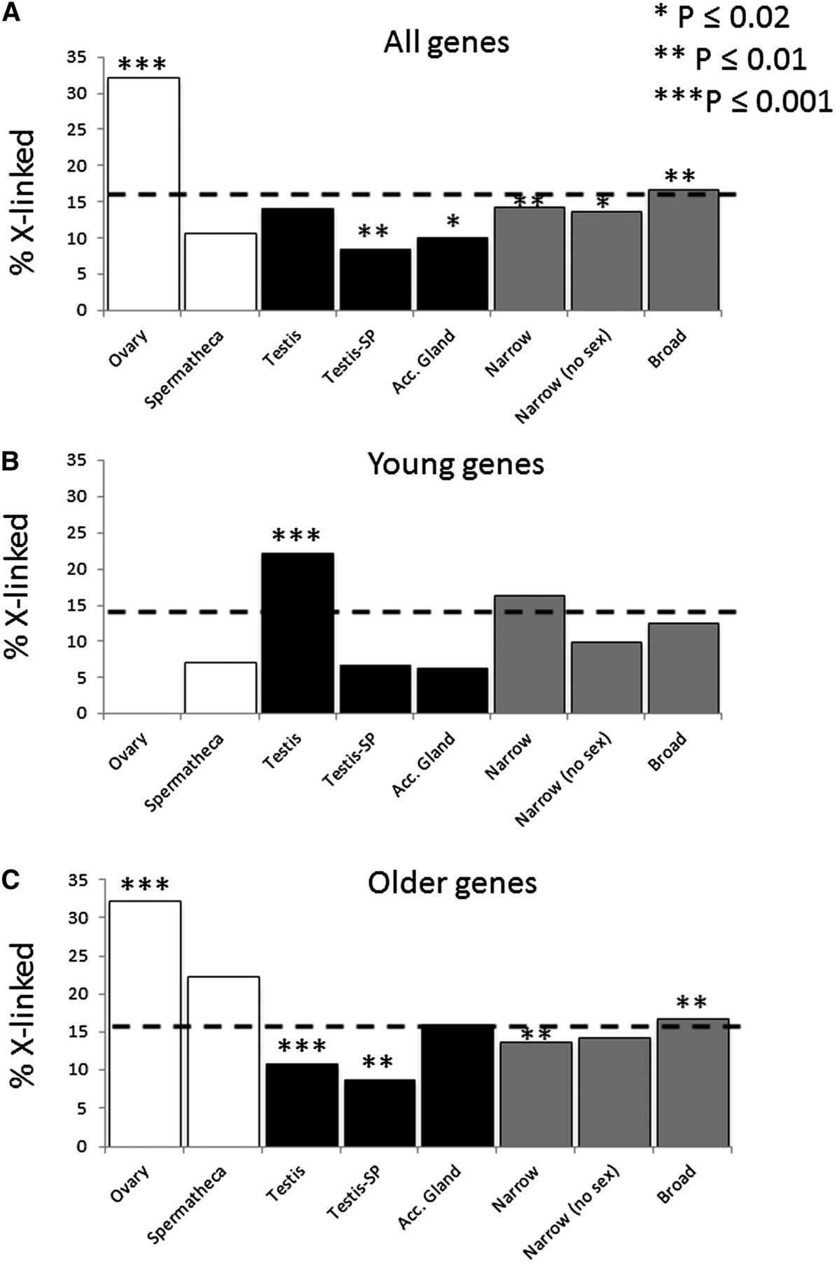 Percentage of D. melanogaster X-linked genes that are broadly and narrowly expressed. Following the methods in Meisel et al. (2012), genes narrowly expressed are also called specific genes (τ > 0.7) in each of four sex-limited tissues, with testis-specific expression and detectable in the sperm proteome (testis-SP), narrowly expressed in any of 14 tissues (narrow), narrowly expressed in one of 10 non-sex-limited tissues (no sex), or broadly expressed genes (τ ≤ 0.4). Percentage of X-linked in the genome are shown by dashed lines. Significant deviations (Fisher's exact test) are indicated: (***) P < 0.001; (**) P < 0.01; (*) P < 0.02. All X-linked genes (A) were separated according to their evolutionary age. New (B) and old (C) genes were defined according to Zhang et al. (2010a), in which old genes are at least as old as the split between Sophophora and Drosophila subgenera. At first (A), there is no paucity of testis-specific genes in the X chromosome. However, opposite patterns are found for old and new genes: Although old testis-specific genes are underrepresented (C), new testis-specific genes are found in excess in the X chromosome (B).