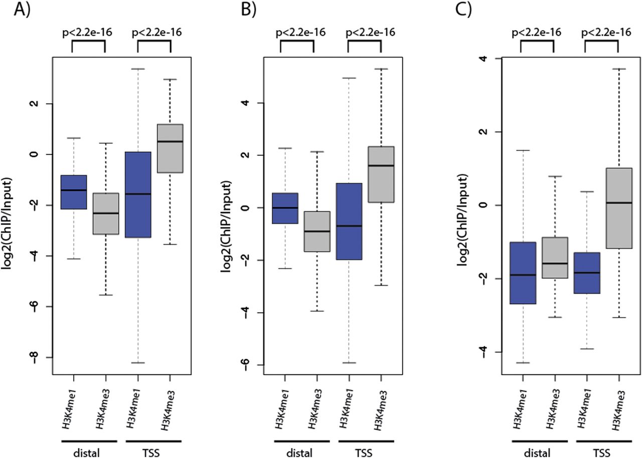 H3K4me1 is enriched at distal p300 peaks in Nematostella. (A,B) Gastrula (A) or planula (B) p300 peaks were split into peaks >300 bp distal to transcription start sites (TSSs) (distal, left) and peaks within 300 bp around TSSs (TSS, right). On the y-axis, the enrichment of H3K4me1 (blue boxes) or H3K4me3 (gray boxes) normalized to input is plotted. Distal p300 peaks have higher H3K4me1 than H3K4me3 levels, a characteristic of enhancers. As expected, p300 peaks around TSSs are more enriched in H3K4me3. (C) Peaks of three different transcription factors (Reb1, Gal4, Phd1) derived from ChIP-exo experiments (Rhee and Pugh 2011) in Saccharomyces cerevisiae were split into distal and TSS overlapping peaks as in A and B. A total of 70% of peaks overlapped TSSs, and the remaining peaks were still within 2 kb around the TSS. On the y-axis, the enrichment of H3K4me1 (blue boxes) or H3K4me3 (gray boxes) normalized to input (Kirmizis et al. 2007) is plotted. P-values were calculated using the Wilcoxon rank sum test.