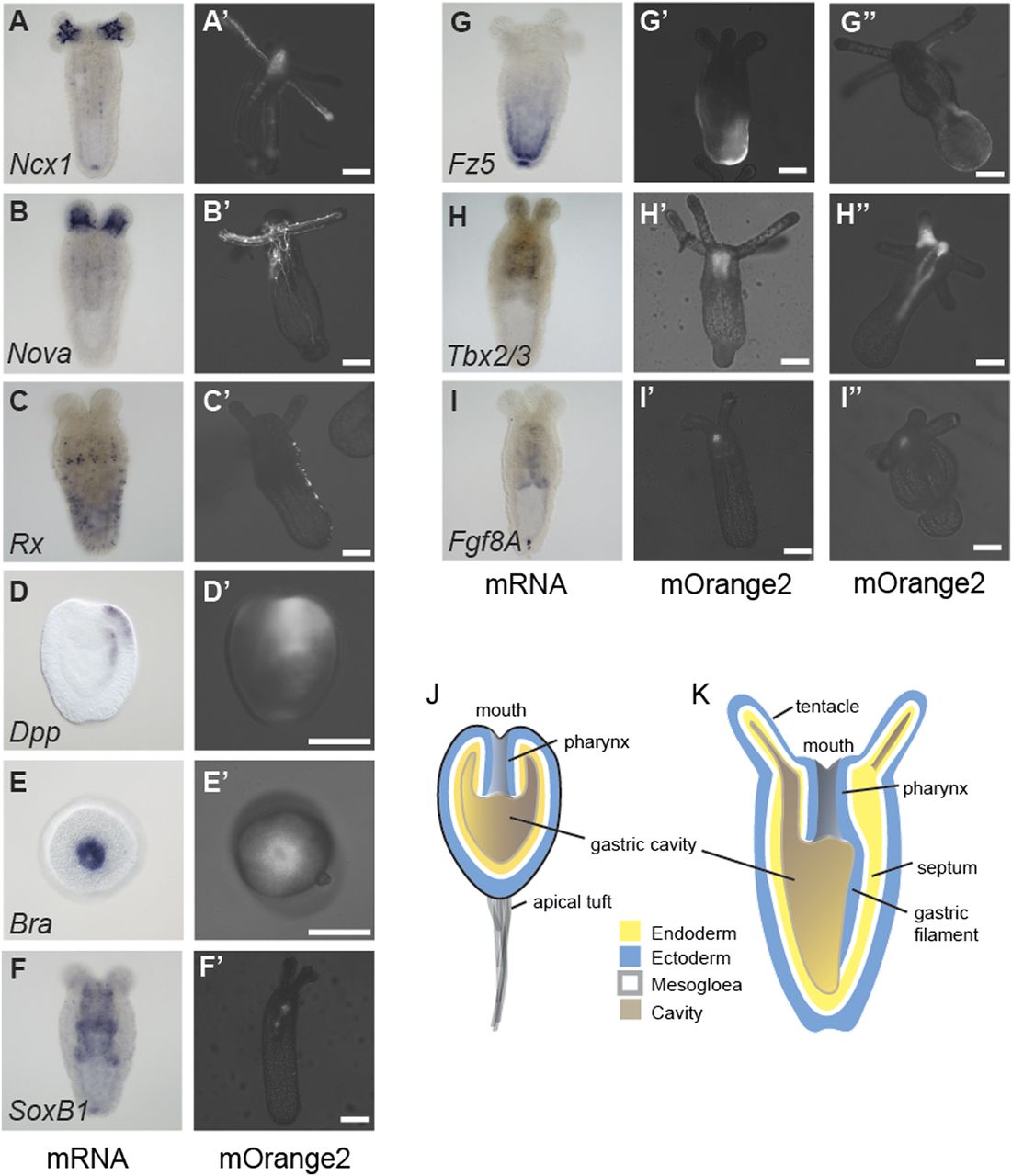 Predicted enhancer elements activate transcription in vivo. (A–I) Whole-mount in situ hybridizations of Nematostella embryos and primary polyps. (A′–I′) Fluorescent mOrange2 signal of live embryos or primary polyps injected with a construct where a predicted enhancer region of the indicated Nematostella gene was driving mOrange2 expression. (G″–I″) Fluorescent mOrange2 signal of live primary polyps injected with a construct where a second predicted enhancer region (different from the region in G′–I′) of the indicated Nematostella gene was driving mOrange2 expression. The Nematostella gene names are indicated inside the in situ hybridization pictures (Nv in the beginning of the gene name was omitted due to space constraints). The white scale bars represent 100 µm. All pictures were taken at the primary polyp stage (>8 d post-fertilization; lateral view) except D and E, which depict planula larvae (lateral view: D,D′; oral view: E,E′). (J,K) Schematic representation of a Nematostella planula larva (J) and primary polyp (K).