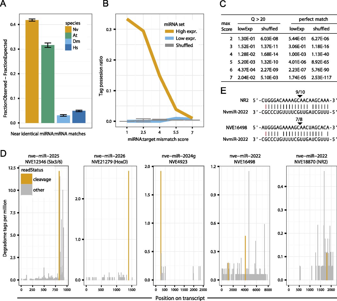 Complementarity of miRNAs to Nematostella transcripts and target cleavage. (A) Distribution of miRNA:mRNA alignment mismatch scores in Nematostella vectensis, Homo sapiens, Drosophila melanogaster, and Arabidopsis thaliana, shown as the difference in abundance between miRNAs and matching shuffled miRNAs, counting the fraction of sequences in each set having a best match with score 2.5 or lower. (B) The tag possession ratio (TPR) of the 75% most expressed (high), the 25% least expressed (low), and shuffled miRNAs as a function of the alignment mismatch score. (C) Fisher’s exact tests comparing the cumulative fraction of predicted cleavage sites supported by degradome reads of the top 75% expressed miRNAs to those with lower expression (bottom 25%), and to shuffled miRNAs, at alignment mismatch score thresholds ranging from 1 to 7. (D) Examples of degradome tag density along predicted miRNA target transcripts. Tags aligning to position 10 of the miRNA are indicated in orange and tags aligning to other positions in the miRNA are in gray. (E) RLM-RACE results for the miR-2022 targets shown in panel D. Cleavage positions are indicated by arrows and ratios of positive clones are shown above.