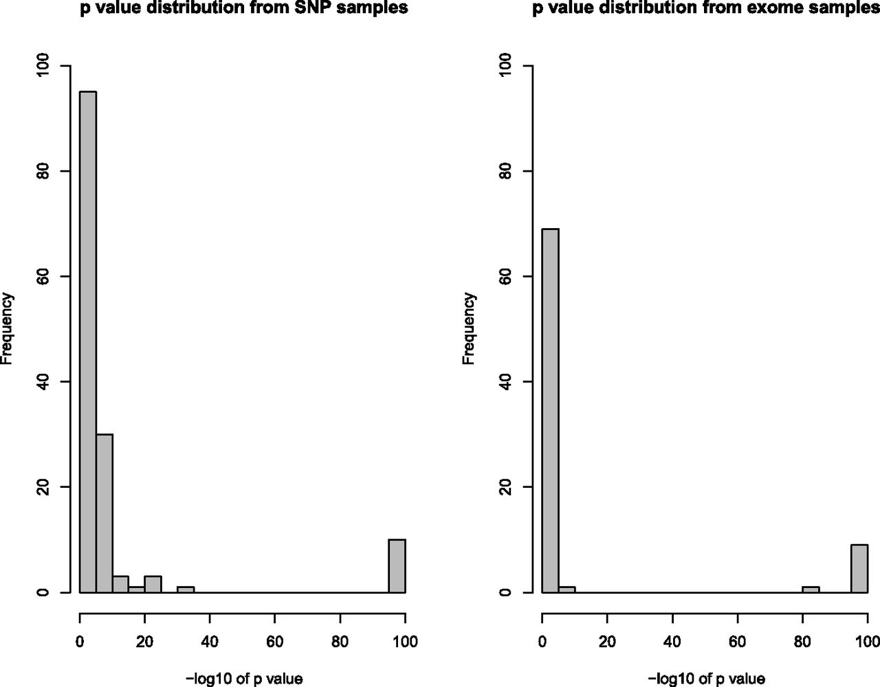DDD UPD P-value distributions. Distribution of the –log10 P-values for UPD detections from different data sources, with or without CNV data. Presence of sample-specific CNV data increases the proportion of extremely significant events and decreases the proportion of marginally significant events. P-value minimum truncated to 1 × 10−100.