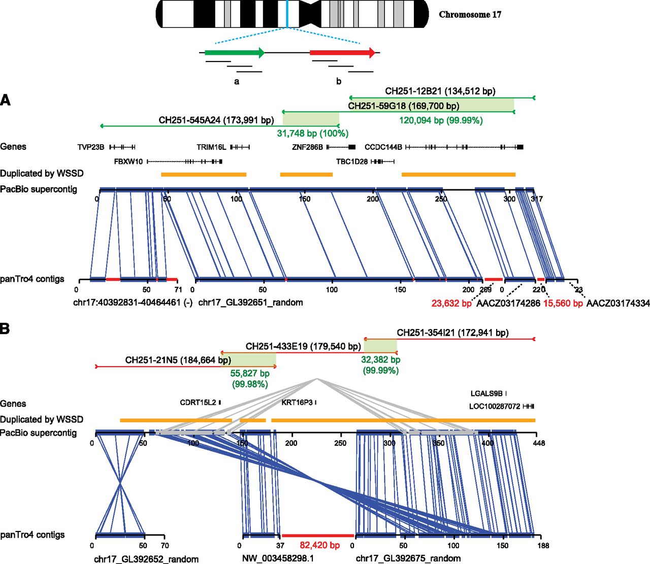 Upgrading a chimpanzee genomic region. Sequence and assembly of six large-insert clones (CH251) from two segmental duplication blocks (red and green) are aligned to their corresponding sequences from the 17p11.2 Smith-Magenis region of the chimpanzee reference assembly (panTro4). Clones were sequenced and assembled from the (A) distal and (B) proximal segmental duplication blocks. The PacBio assembly was compared with the corresponding working draft sequences from panTro4. The alignment identity of panTro4 contigs without gap sequence and the PacBio supercontigs is 94.69% over 525 kbp of aligned sequence. Thirty-one percent (241/766 kbp) of the chimpanzee sequence is missing within the working draft assembly. The average sequence identity for phred >30 bp from BAC end sequence (BES) mappings was 99.72% (16,174/16,220 high-quality bases) and 99.98% (156,955/156,991 high-quality bases) from fosmid end sequence (FES) mappings. Gaps in the panTro4 contigs are indicated in red. Gene annotations are shown based on a custom liftover from RefSeq annotations of GRCh37 in the corresponding regions of 17p11.2. The missing sequence corresponds to high-identity segmental duplications (orange bars represent segmental duplications predicted by whole-genome shotgun sequence detection or WSSD). The clone CH251-545A24 was previously sequenced with capillary sequencing (GenBank accession: AC183294).