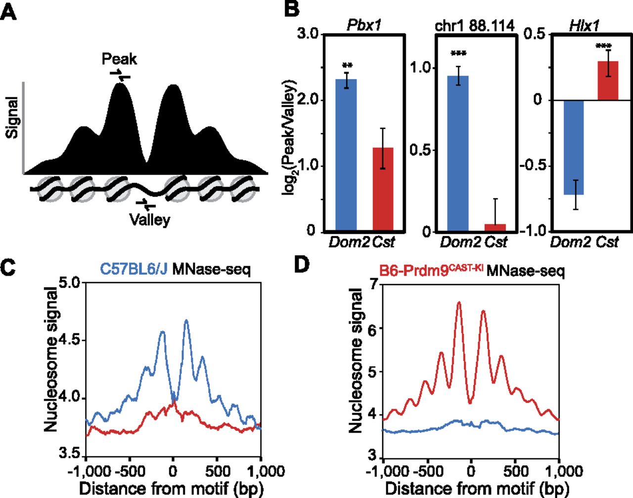 Nucleosome positions at hotspots are variable prior to PRDM9 binding. (A) Schematic of an idealized PRDM9-modified hotspot showing signal intensity representing nucleosome positions. Primers for qPCR were designed to amplify DNA from either the −1 or +1 nucleosomes flanking the NDR (peak) or from within the NDR (valley). (B) Ratio of nucleosome peak vs. nucleosome-depleted valley signal in two genetic backgrounds. qPCR was performed on MNase-digested spermatocyte chromatin DNA from both strains (blue: DNA from Prdm9Dom2; red: Prdm9Cst). Error bars represent standard deviation of triplicate measurements from three biological replicates. (**) P < 0.01, (***) P < 0.001; one-sided t-test. Hotspots Pbx1 and chr1 88.114 Mb are PRDM9Dom2-activated; hotspot Hlx1 is PRDM9Cst-activated. (C) Aggregation plot showing nucleosome positions at hotspots inferred from MNase-seq of C57BL/6J spermatocytes. Only hotspots containing a motif that is predicted to be recognized by the endogenous Prdm9 allele show organized nucleosomes (blue: aggregation of Prdm9Dom2 sites; red: Prdm9Cst sites). (D) Aggregation plot of Prdm9Dom2 and Prdm9Cst hotspots from sequencing of mononucleosome DNA prepared from B6-Prdm9CAST-KI spermatocytes.