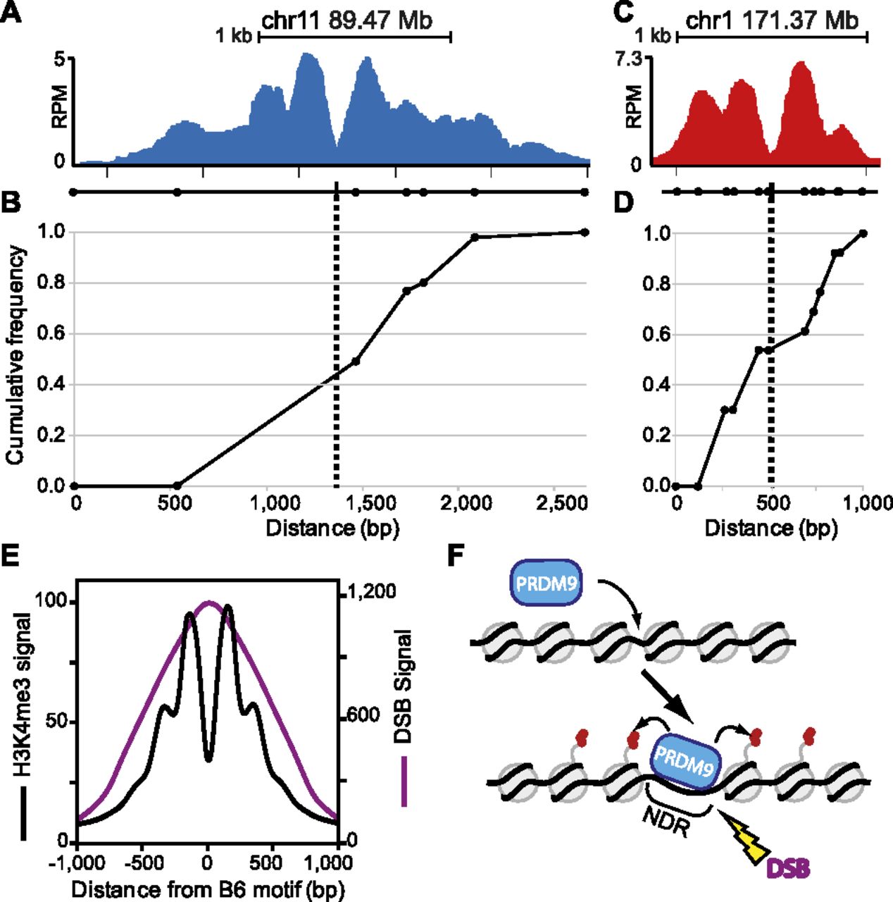 Location of meiotic crossing-over is constrained by PRDM9-dependent chromatin modification. (A) ChIP-seq coverage profile for the PRDM9Dom2-activated hotspot at chr11 89.47 Mb showing nucleosome peaks and central NDR. The black line underneath the nucleosome profile indicates the positions of SNPs (circles) between the B6 and CAST strains used to map recombination and the PRDM9Dom2 binding site from Supplemental Figure S5 (black box). (B) Cumulative frequency of recombination in B6 × CAST F1 progeny plotted against the scaled distance across the H3K4me3 signal track (n = 56 recombinant mice). (C,D) Similar to A and B except for the PRDM9Cst-activated hotspot at chr1 171.37 Mb. (C) ChIP-seq coverage profile showing nucleosome peaks and central NDR. SNPs assayed for recombination between B6 and CAST strains are indicated below as circles and PRDM9Cst binding site from Figure 4F is shown (black box). (D) Cumulative frequency of recombination at this hotspot (n = 13). (E) Aggregation plot of Prdm9Dom2 hotspots for mean H3K4me3 signal (black line) and mean DMC1 ChIP-seq signal representing the position of meiotic DSBs (purple line, n = 7235 peaks, DSB data from Brick et al. [2012]). (F) Model of PRDM9 activation of hotspots. Prior to PRDM9 binding, hotspot nucleosome positions can be variable. Upon binding, PRDM9 modifies surrounding nucleosomes (red circles), which are remodeled to create a central nucleosome-depleted region (NDR). Later, DNA double-strand breaks (DSBs) are introduced at the NDR.