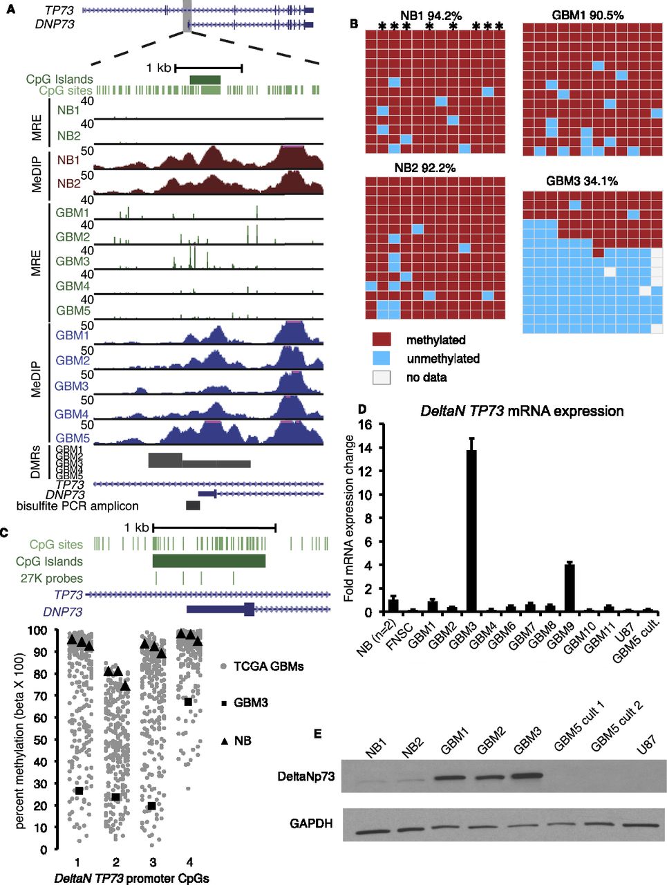 TP73 gene body CGI hypomethylation associated with activation of the oncogenic DeltaN TP73 isoform. (A) Strong focal hypomethylation in GBM 3 detected by MeDIP-seq and MRE-seq. (B) Bisulfite sequencing for two normal brains (top) and GBMs 1 and 3 (bottom). Asterisks indicate CpGs with MRE sites. (C) Infinium HumanMethylation27 array data at the DeltaN TP73 promoter. Percent methylation for four CpGs, shown schematically at the top, is graphed below. (Gray points) 292 TCGA-assayed GBMs. (Black squares) GBM 3. (Black triangles) Normal brains. (D) Quantitative RT-PCR for the oncogenic DeltaN TP73 mRNA isoform. Fold expression ± SD relative to the average of two normal brains is graphed for a representative experiment. (NB) Normal brain. (FNSC) Cultured fetal neural stem cells. (U87) GBM cell line. (GBM5 cult.) Short-term serum-grown culture of GBM 5. (E) Western blotting with anti-deltaNp73 (top) and anti-GAPDH control (bottom).