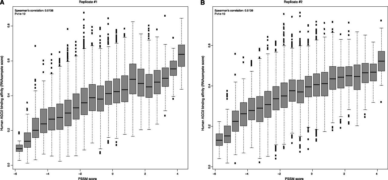 Significant correlation between RNAcompete scores and PSSM scores for the identified motif in replicate 1 (A) and replicate 2 (B). In both panels, the higher RNAcompete scores indicate greater binding specificities of AGO2 measured from the assay. Similarly, higher PSSM scores represent a greater resemblance of the identified motif. It is clear that sequences with high similarity with the identified motif tend to have a higher binding specificity of human AGO2.