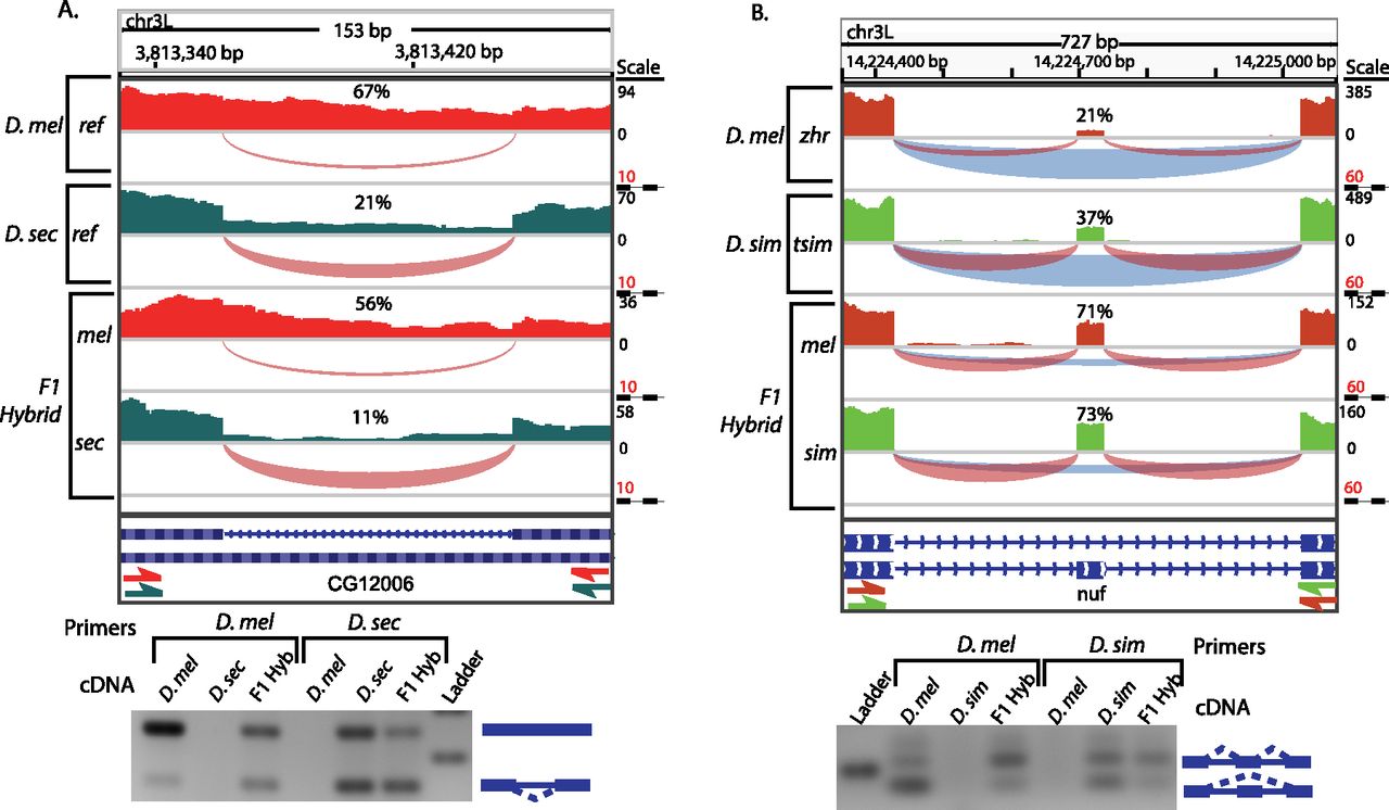 Cis- and trans-acting differences in alternative splicing. IGV Genome Browser images show RNA-seq read coverage, depicted in a bar graph (above). Arcs depict splice-junction read coverage (per million mapped junction reads). The width of each arc represents the relative number of junction reads. For exon skipping, exclusion junctions are shown in blue and inclusion junctions are shown in red. The percent spliced in (PSI) for each sample is shown above the alternative event. Gel images show the results of RT-PCR experiments using species-specific primers. (A) An intron in CG12006 is retained much more frequently in D. melanogaster than in D. sechellia. In F1 hybrids, allele-specific splicing differences show that the divergence is predominantly cis-acting. (B) An exon in nuf is skipped more frequently in D. melanogaster than in D. simulans. Allele-specific RNA-seq from F1 hybrids shows equal inclusion levels, suggesting that divergence in nuf splicing is predominantly trans-acting.