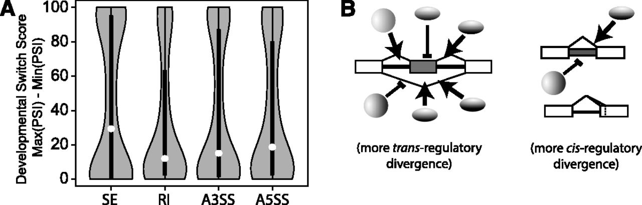 Differences in regulatory network architecture among classes of alternative splicing impact their regulatory divergence. (A) Skipped exons are more dynamically regulated throughout development. Violin plots show the distribution of switch scores (maximum percent inclusion minus minimum percent inclusion) for splicing events from each class of alternative splicing throughout development in D. melanogaster (Graveley et al. 2011). The median switch score (white dots) is highest for SE events. (B) Model of regulatory network differences among splicing classes. Skipped exons have a larger trans-mutational target size compared to other splicing classes and SE regulation diverges more rapidly through changes in trans-acting factors.