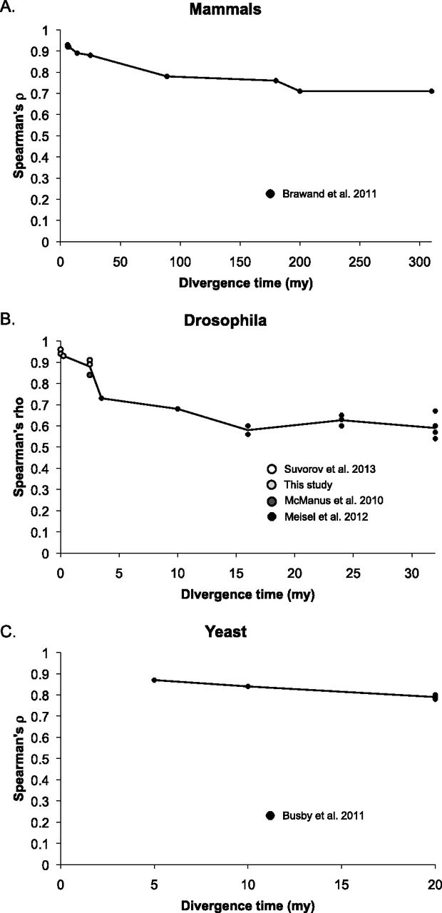 Expression divergence in mammals, Drosophila, and yeast. (A) Expression similarity (Spearman’s ρ) was calculated using RNA-seq data from kidneys published in Brawand et al. (2011) comparing human samples with those of eight other mammalian species and one bird. We chose to analyze the data from kidneys because they were the most representative of all the tissues examined (excluding testes). Divergence times in millions of years are as reported in Brawand et al. (2011). (B) Expression similarity (Spearman’s ρ) was calculated for data described in this paper (light gray circles) as well as data published in Suvorov et al. (2013) (open circles), McManus et al. (2010) (gray circles), and Meisel et al. (2012) (black circles). Divergence times for mel-mel, sim-sech, and mel-sim are as described in Figure 1A. For all other comparisons, estimated divergence times from Obbard et al. (2012) were used. (C) Expression similarity (Spearman’s ρ) was calculated using the data reported in Busby et al. (2011) for all pairwise comparisons of four yeast species. Divergence times for these species are from Kellis et al. (2003). In all three cases, the black line connects the average value of ρ for each divergence time sampled.
