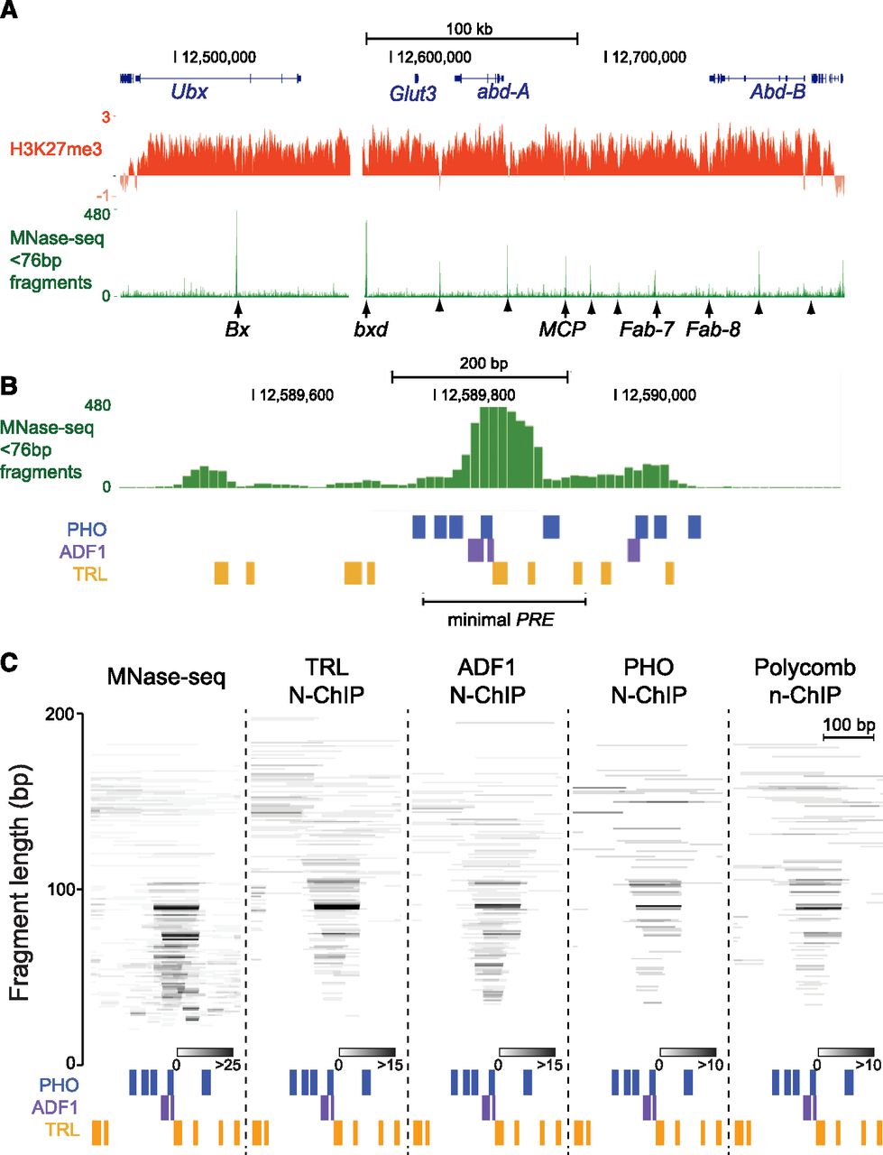Regulatory elements within the BX-C are clusters of factor-occupied sites. (A) UCSC Genome Browser snapshot of the 330-kb H3K27me3 domain containing the BX-C on chromosome 3R in S2 cells. The distributions of H3K27me3 (modENCODE data) and non-nucleosomal MNase-seq fragments (<76-bp fragments) are shown. Genetically defined PREs (arrows) and regulatory elements inferred from X-ChIP mapping (Schwartz et al. 2006) (arrowheads) are indicated. (B) Browser snapshot of non-nucleosomal MNase-seq fragments at the bxd PRE (chromosome 3R:12,589,450–12,590,250). The positions of high-scoring (P < 5 × 10−4) TRL, PHO, and ADF1 motifs. The segment containing the minimal functional PRE was previously defined (Sipos et al. 2007). (C) Individual fragments in MNase-seq or recovered in the indicated N-ChIP experiments that map to the protected structure (chromosome 3R:12,589,700–12,590,000) at the bxd PRE. Positions of high-scoring (P < 5 × 10−4) TRL, PHO, and ADF1 motifs are indicated. Fragments are positioned on the y-axis by their lengths, and coincident fragments are indicated in shades of gray.
