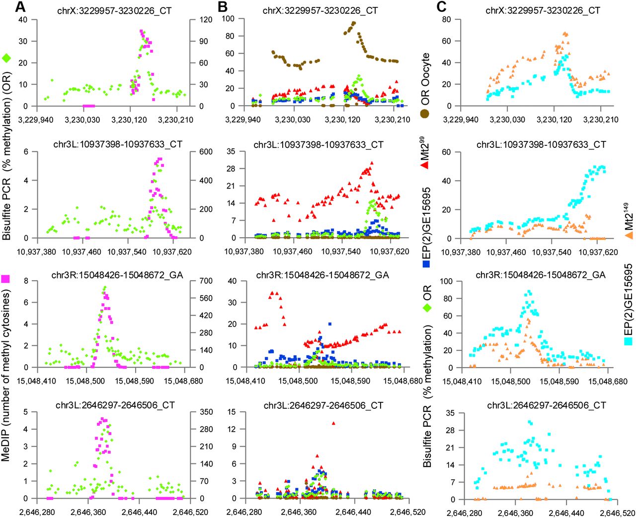 Direct amplification of bisulfite-converted DNA confirms methylation patterns and the presence of methylation in the absence of MT2. Four regions selected from the 66 that were analyzed (the full set is displayed in Supplemental Figs. S5, S8). Methylated regions identified by MeDIP-Bseq were PCR amplified from bisulfite converted DNA and Illumina sequenced to at least 10,000× coverage. Each dot represents one cytosine position. (A) bisulfite PCR (green); MeDIP-Bseq (purple). The y-axis at the left indicates the percentage of methylated cytosines in the bisulfite PCR; the y-axis at the right indicates the number of methylated cytosines detected by MeDIP-Bseq. Although the MeDIP-Bseq analysis is not quantitative, bisulfite PCR demonstrates the proportion of methylated cytosines at a given position, as well as the pattern of methylation of the amplified region. There is good agreement in the pattern of methylation detected by the two methods. (B) bisulfite PCR (green) (same data as A); unfertilized oocyte (brown); Mt2 deficient (Mt299) (red); EP(2)GE15695 (Mt2 wild type; strain provided by F. Lyko) (blue). The y-axis indicates the percenage of methylated cytosines in the bisulfite PCR. Methylation is also present in flies deficient for the DNA methyltransferase MT2 and at some loci in unfertilized oocytes. (C) Wild type EP(2)GE15695 (Mt2 wild type; stage 5 DNA provided by G. Reuter) (light blue); Mt2 deficient (Mt2149) (orange).