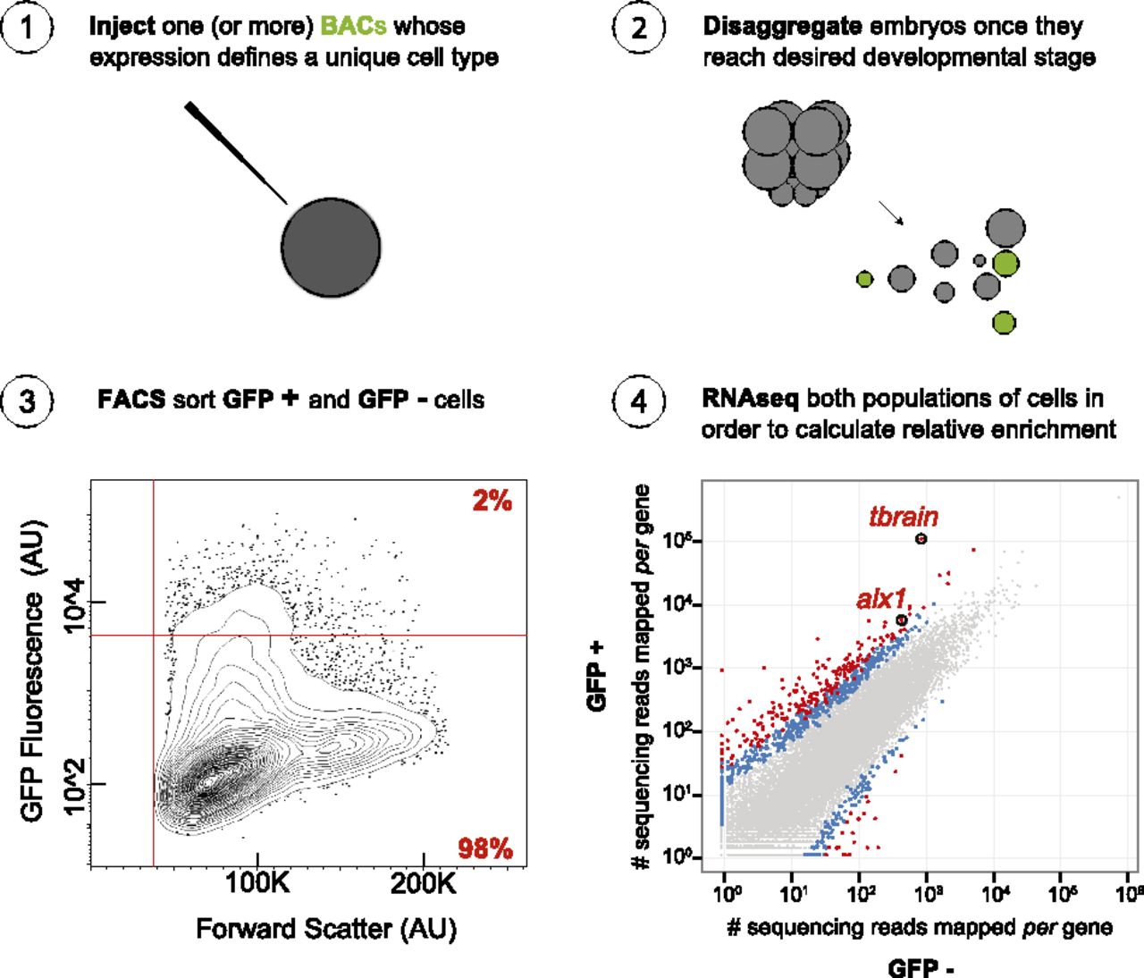 Steps required for attaining cell type-specific transcriptomes. (1) Microinject a group of zygotes with an artificial chromosome genetically engineered to express a fluorescent reporter in the cell type of interest; (2) culture transgenic zygotes until they have reached the desired developmental stage, then disaggregate the embryos to individual cells; (3) run the cells through flow cytometry in order to segregate populations of cells by way of FACS; and (4) isolate, amplify, sequence, and quantify the pool of mRNA from each population in order to calculate relative enrichment for each gene. (AU) Arbitrary units; (BACs) bacterial artificial chromosomes.