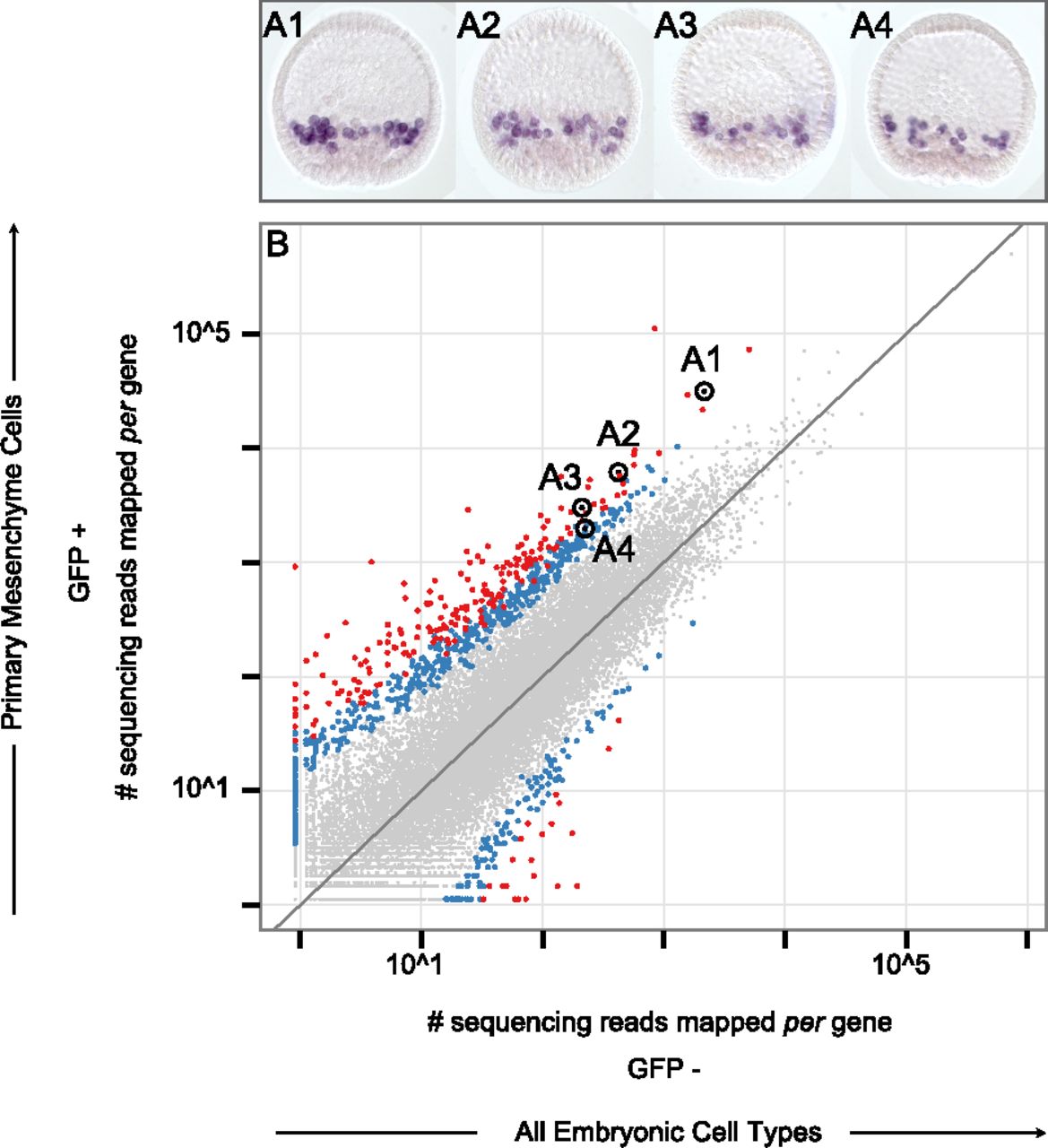 Corroboration of cell type specificity. (A1–A4) Four of the genes tested for cell type-specific expression. Fixed Sp blastula with PMCs labeled in purple. Labeling was achieved by whole mount RNA in situ hybridization of cah10l (A1), msp130r1 (A2), p16 (A3), and 3apcol (A4). (B) Scatterplot identical to those described in Figure 4. Data points corresponding to the genes shown in A1–A4 have been encircled in order to distinguish them from other differentially expressed genes and labeled accordingly. Supplemental Table 1 lists all genes corroborated in a similar manner and the supporting data are shown in Supplemental Figures 4–12.