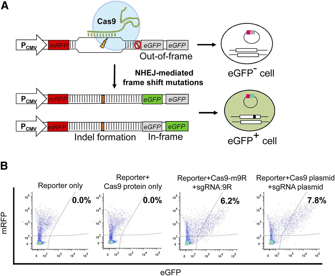 Cas9-m9R and sgRNA:9R-mediated mutagenesis of an episomal target sequence. (A) Schematic representation of the cell-based reporter assay. (B) Representative flow cytometry of reporter-transfected cells sequentially treated with Cas9-m9R and sgRNA:9R three times or those transfected with plasmids encoding Cas9 and sgRNA as the positive control. The cells were analyzed 3 d after the first treatment with Cas9-m9R and sgRNA:9R or transfection with plasmids encoding Cas9 and sgRNA. The percentages of GFP+ cells are indicated.