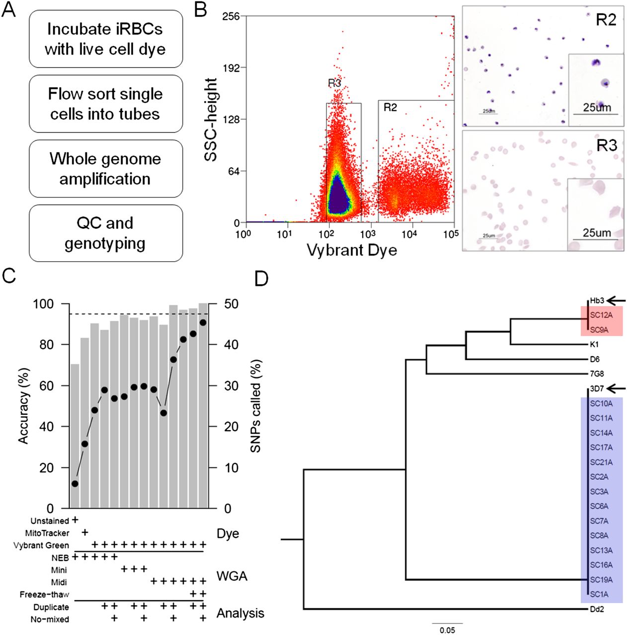 Validation of single-cell genotyping in P. falciparum. (A) The single-cell sorting protocol. (B) We validated that live cell dyes specifically isolate iRBCs from malaria parasite cultures by making giemsa stained smears of cells passing through gates R2 (iRBCs) and R3 (uninfected RBCs)—the full sorting strategy is shown in Supplemental Figure 1. (C) Accuracy (gray bars) and percentage of SNPs called (black dots) of SCG approaches were determined using mixtures of known parasite genotypes. The dyes, WGA kits (PicoPLEX [NEB], REPLI-g Midi and Mini), and analysis parameters are shown below the graph. The rightmost bar shows the optimal protocol determined during our validation. The dashed line denotes 95% accuracy. (D) This optimal protocol accurately clustered single-cell genotypes as 3D7 or Hb3 genotypes without discrepancies. Single-cell genotypes are prefixed “SC” and parental lines named in full and highlighted by arrows. We also include four laboratory strains as genotyping controls: Dd2, 7G8, K1, and D6.