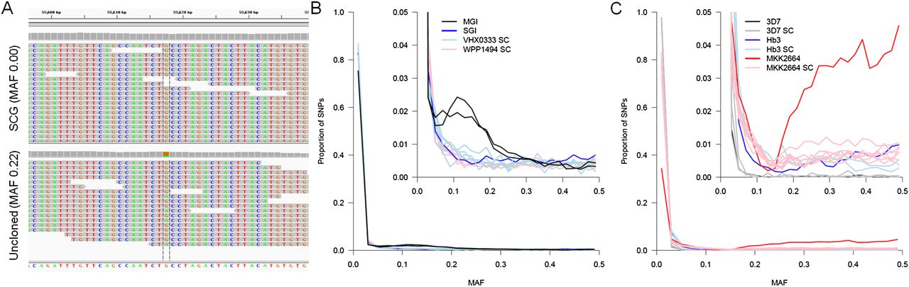 Purity of single-cell genome sequence data. SNPs with 30–250× read depth were used to estimate the purity of single-cell data. (A) At variant sites we expect to detect both alleles in deep-sequence data from an uncloned infection (bottom) while these sites should be invariant in single-cell sequence (top). The within-host minor allele frequency (MAF) was estimated from all Q30 SNPs after exclusion of regions of the genome with known high error rates (i.e., vir/var gene clusters and nonexonic regions for P. falciparum). (B) Genome sequencing from single P. vivax cells shows a similar distribution of mixed sites to a putatively single clone infection (SGI; VHX0333). Genome sequence from an MGI (VHX059) is shown to highlight the clear difference from clonal lines. (C) Genome sequencing from single P. falciparum cells from both mixture experiments and a genuine infection (MKK2664) shows a similar proportion of sites showing multiple alleles as other putatively clonal genome sequences. For comparison, genome sequence from the Hb3 and 3D7 laboratory lines used in mixture experiments are shown.