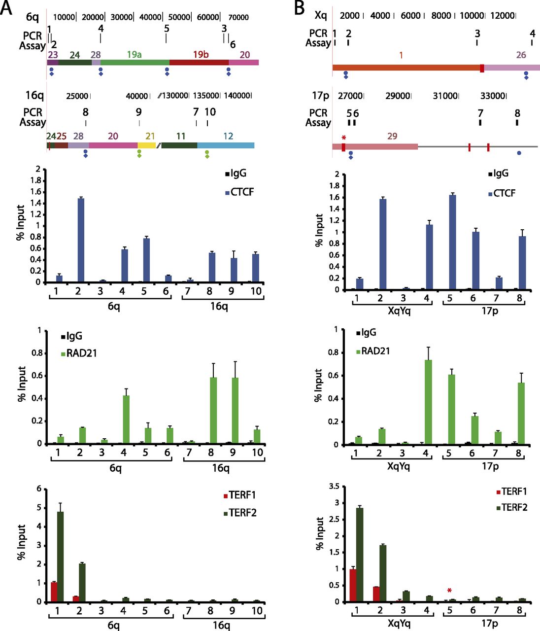 ChIP-qPCR analysis of subtelomeric DNA protein binding sites predicted by ChIP-seq data set mappings. Candidate sites of CTCF, cohesin, TERF1, and TERF2 binding were analyzed by ChIP-qPCR. Segments of the 6q and 16q (A) and the Xq and 17p (B) subtelomeres are shown, with the coordinates (in bp) shown at the top and the subtelomere paralogy regions indicated on the respective segments. The positions of ITSs are indicated by red rectangles extending from the segments; an ITS with called TERF1 and TERF2 ChIP-seq enrichment peaks is marked with a red asterisk. The positions of colocalized CTCF and cohesin (RAD21) peaks called in LCLs are shown as green dots (if not called in other cell types) and as blue dots (if also called in ES and/or IMR90 cells). A diamond beneath a dot indicates a site where no ChIP-seq peak was called when only uniquely mapping reads were considered. Numbered ticks show the positions of primer sets used in the ChIP-qPCR experiments, and correspond to the numbered ChIP-qPCR results shown for CTCF, RAD21, and TERF1 and TERF2 graphed as the percentage of input DNA. The bar graphs represent the average of percentage input (mean ± SD) for each ChIP from three independent ChIP experiments. Ticks numbered 1 and 2 are qPCR assays for DNA immediately adjacent to the telomere, used here as positive controls for TERF1 and TERF2 binding (primer positions 1 and 2) and a positive control for a previously validated subtelomeric CTCF/RAD21 colocalization site (primer position 2).